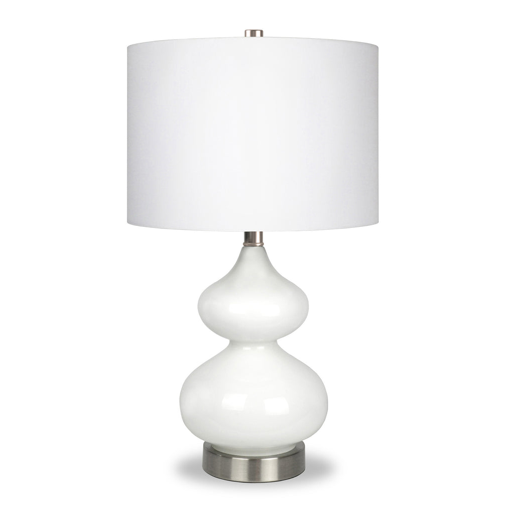 This 23-inch white and silver glass table lamp with white drum shade is the perfect combination of design and function. A gorgeous white and silver glass base brings just the right amount of pizzazz to this fabulous lamp. The white drum fabric shade is a great compliment to this lamp. This standard table lamp is designed to provide general lighting to the area. High quality design makes this a great lamp for not only lighting, but accenting a room with style. Bring some lite and good vibes into your space with this updated and stylishly designed lamp. 23-inch H x 13-inch W x 13-inch D