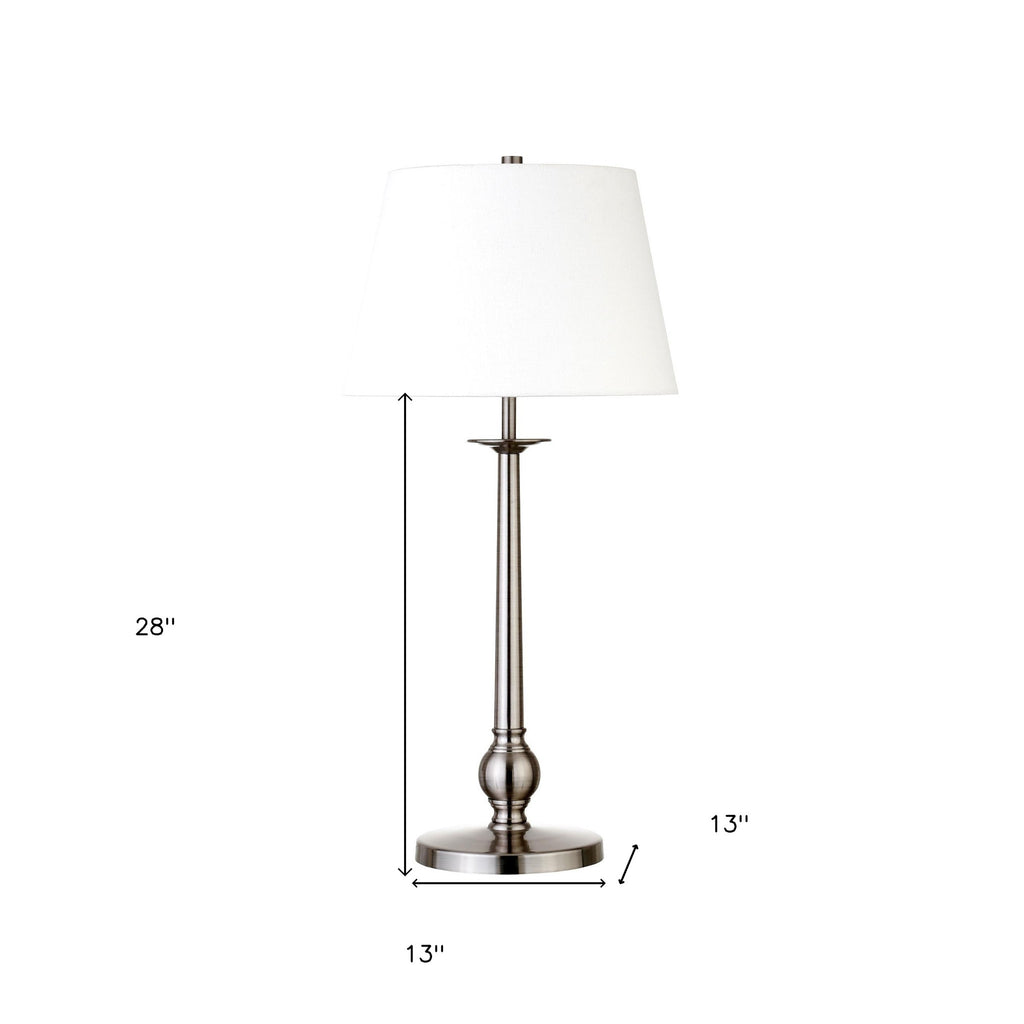 This 24-inch nickel glass table lamp with white drum shade is a great way to add some brightness to any corner of your home. The lamp is made of sturdy glass and features a nickel color. Includes a white fabric, drum shaped shade, making this a fashionable piece that will complement most any interior. This standard table lamp is designed to provide general lighting to the area. Use this lamp anywhere and elevate the look of the whole space. Bring some lite and good vibes into your space with this updated and stylishly designed lamp. 24-inch H x 15-inch W x 15-inch D