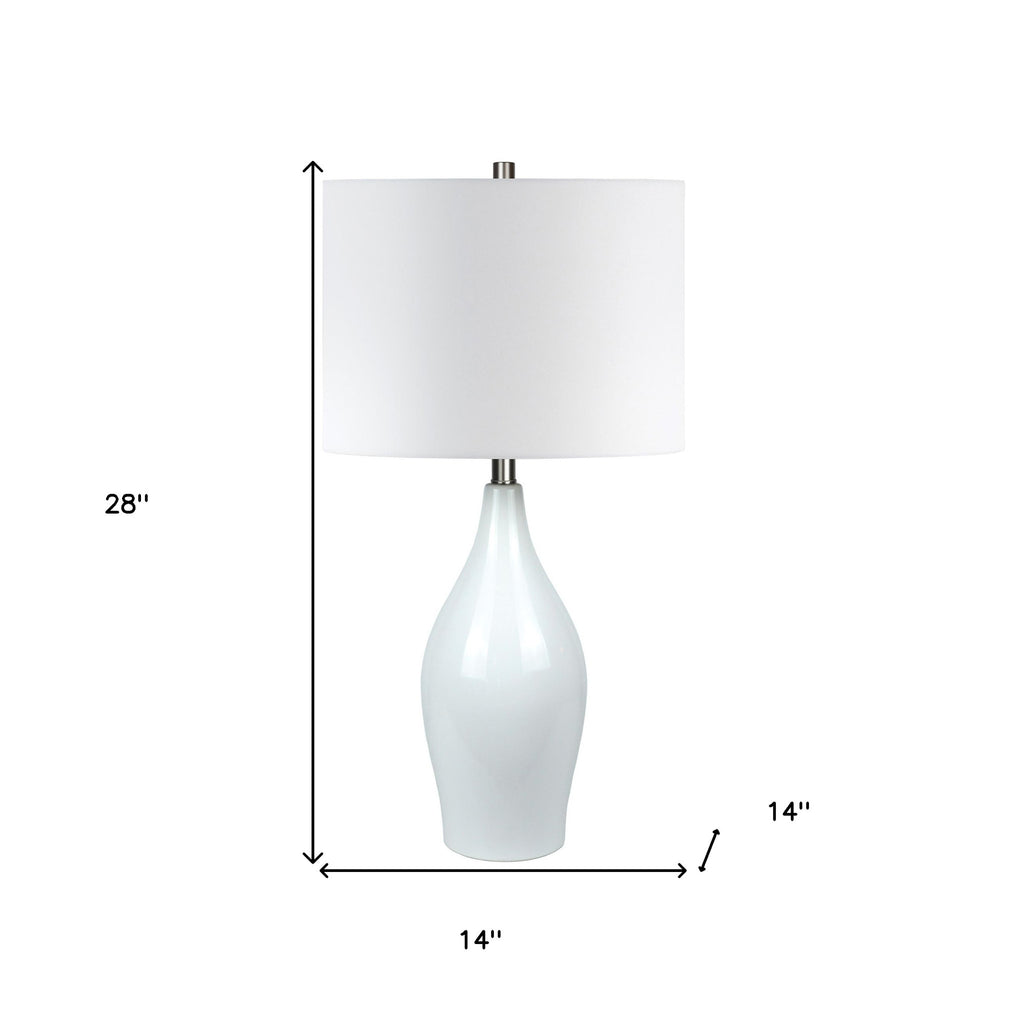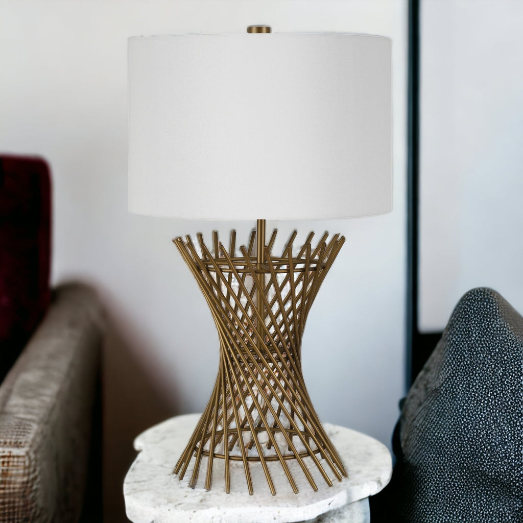 Embrace the good life with this hard working and stylish 25-inch antiqued brass metal adjustable table lamp with white drum shade. The base of this lamp is made of antiqued brass metal. The white shade has a drum shape and is made from fabric. This standard table lamp is designed to provide general lighting to the area. The light that this lamp throws is soft and warm to elevate the look of most any space in your home. The perfect lamp to create just the right natural and soothing light in your space. 25-inch H x 15-inch W x 15-inch D