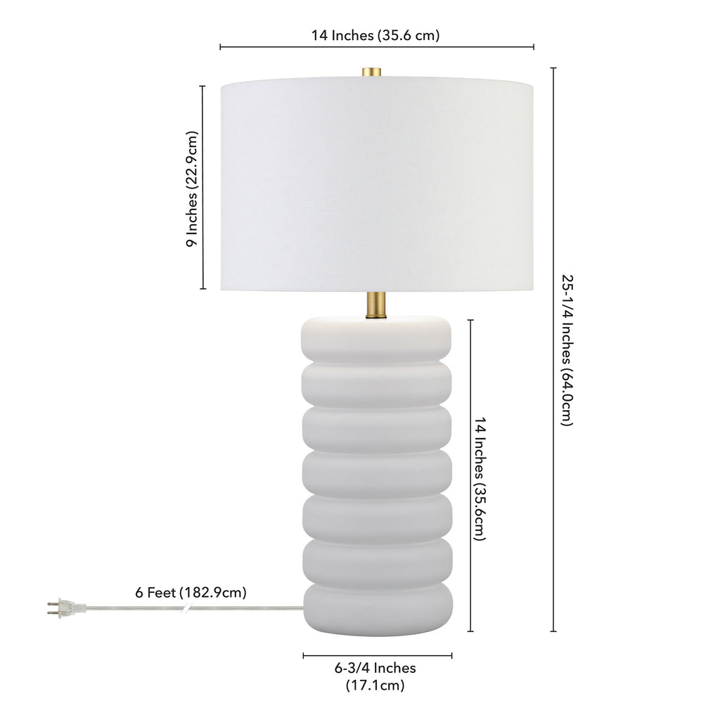 Add a bright anchor to your room with this 25-inch navy blue ceramic table lamp with white drum shade. A gorgeous navy blue ceramic base brings just the right amount of pizzazz to this fabulous lamp. The white shade has a drum shape and is made from fabric. This standard table lamp is designed to provide general lighting to the area. The light that this lamp throws is soft and warm to elevate the look of most any space in your home. It is perfect for virtually any decor. 25-inch H x 14-inch W x 14-inch D