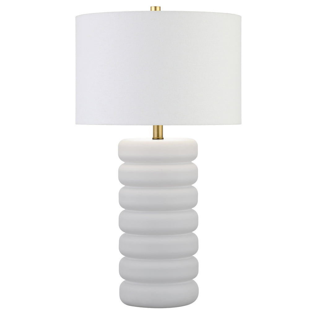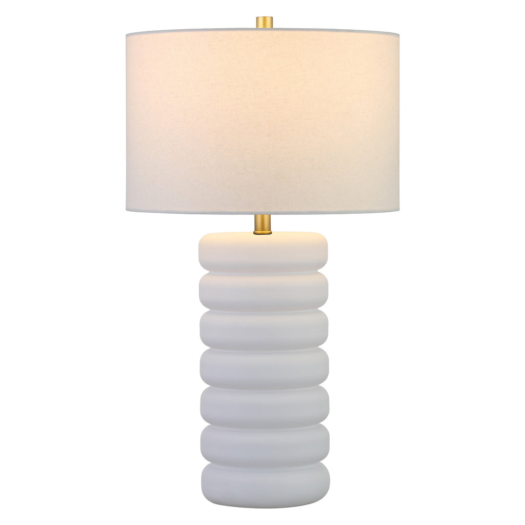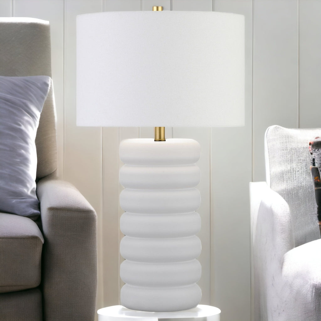 This 25-inch white ceramic table lamp with white drum shade is the perfect combination of design and function. The lamp is made of sturdy ceramic and features a white color. The white shade has a drum shape and is made from fabric. This standard table lamp is designed to provide general lighting to the area. High quality design makes this a great lamp for not only lighting, but accenting a room with style. It is perfect for virtually any decor. 25-inch H x 14-inch W x 14-inch D