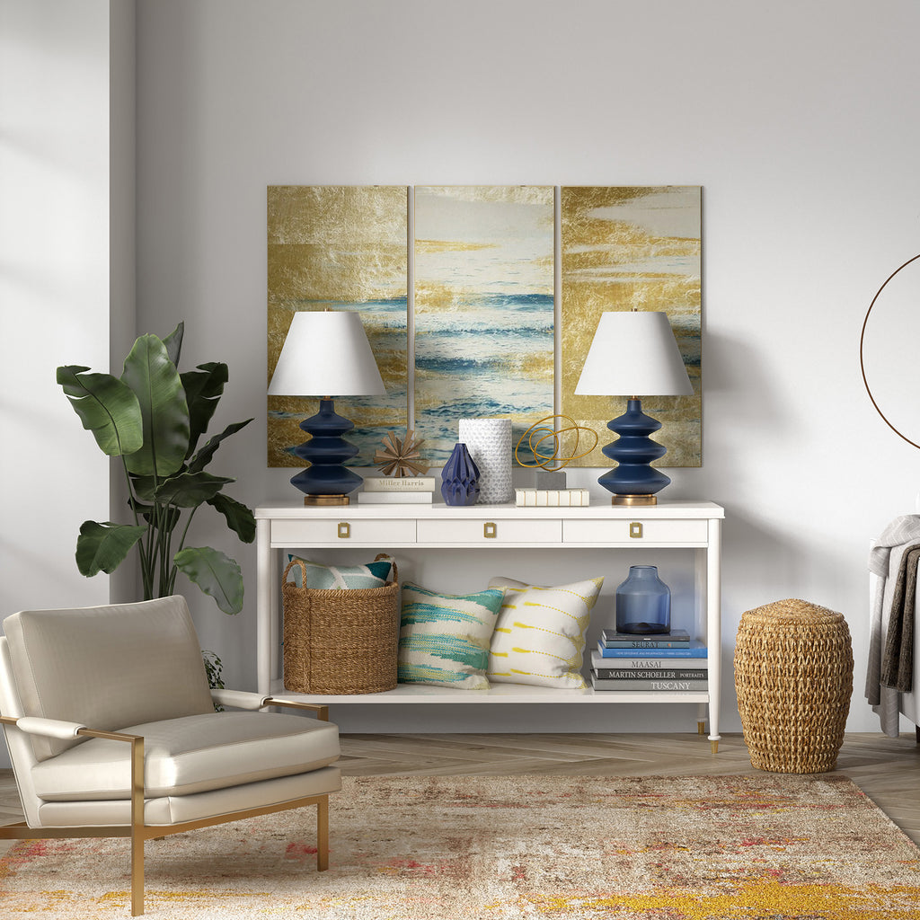 With this 26-inch blue and gold glass table lamp with white empire shade you can bring in design to any space along with adding some ambient lighting. The base of this lamp is made of glass finished in a blue and gold tone. The white shade has a empire shape and is made from fabric. This standard table lamp is designed to provide general lighting to the area. The light that this lamp throws is soft and warm to elevate the look of most any space in your home. It is perfect for virtually any decor. 26-inch H x 16-inch W x 16-inch D