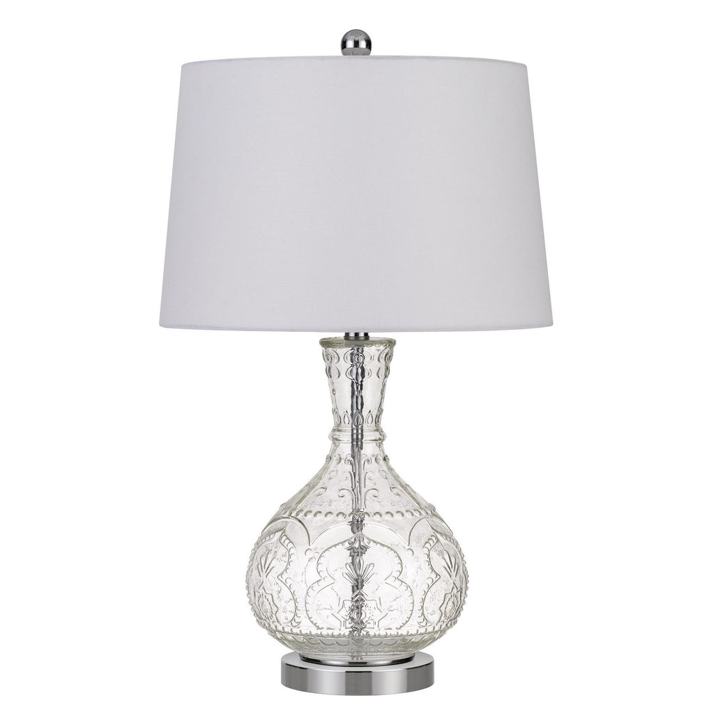 Add a bright anchor to your room with this 27" clear metal table lamp with white rectangular shade. The base of this lamp is made of metal finished in a clear tone. Includes a white fabric, rectangular shaped shade, making this a fashionable piece that will complement most any interior. This standard table lamp is designed to provide general lighting to the area. High quality design makes this a great lamp for not only lighting, but accenting a room with style. The perfect lamp to create just the right natural and soothing light in your space. 27" H x 16" W x 16" D