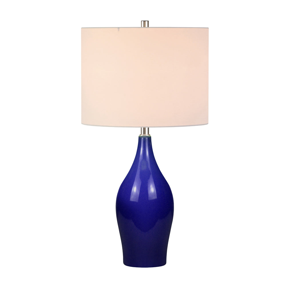 This 28-inch navy blue porcelain table lamp with white drum shade is the perfect combination of design and function. The lamp is made of sturdy porcelain and features a navy blue color. The white drum fabric shade is a great compliment to this lamp. This standard table lamp is designed to provide general lighting to the area. Use this lamp anywhere and elevate the look of the whole space. It is perfect for virtually any decor. 28-inch H x 14-inch W x 14-inch D