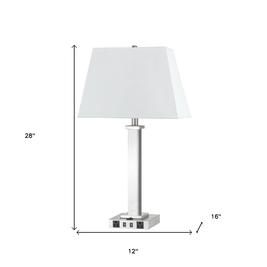 This 28-inch nickel metal usb table lamp with white shade is the perfect combination of design and function. The base of this lamp is a column made of metal finished in a nickel tone in a shiny and smooth finish. The white shade has a rectangular shape and is made of linen, which makes it a perfect choice. This standard table lamp is designed to provide general lighting to the area. High quality design makes this a great lamp for not only lighting, but accenting a room with style. It is perfect for virtually any decor. 28-inch H x 12-inch W x 16-inch D