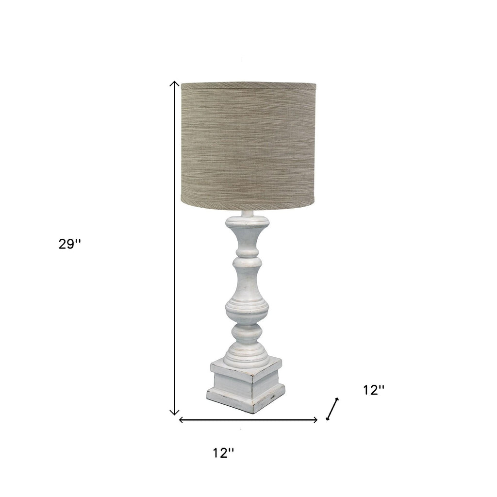 Add classically good-looking lighting to your space with this 29'" Distressed Whitewashed Beige and White Shade Table Lamp. The traditionally shaped, turned chunky square base pairs nicely with the beige linen shade. This lamp not only radiates soft warm light, but it also becomes a great decorative lamp for your table, desk, or nightstand. The base is constructed of sturdy polyresin and is finished in a rustic slightly distressed deep black. 29" x 12" x 12.