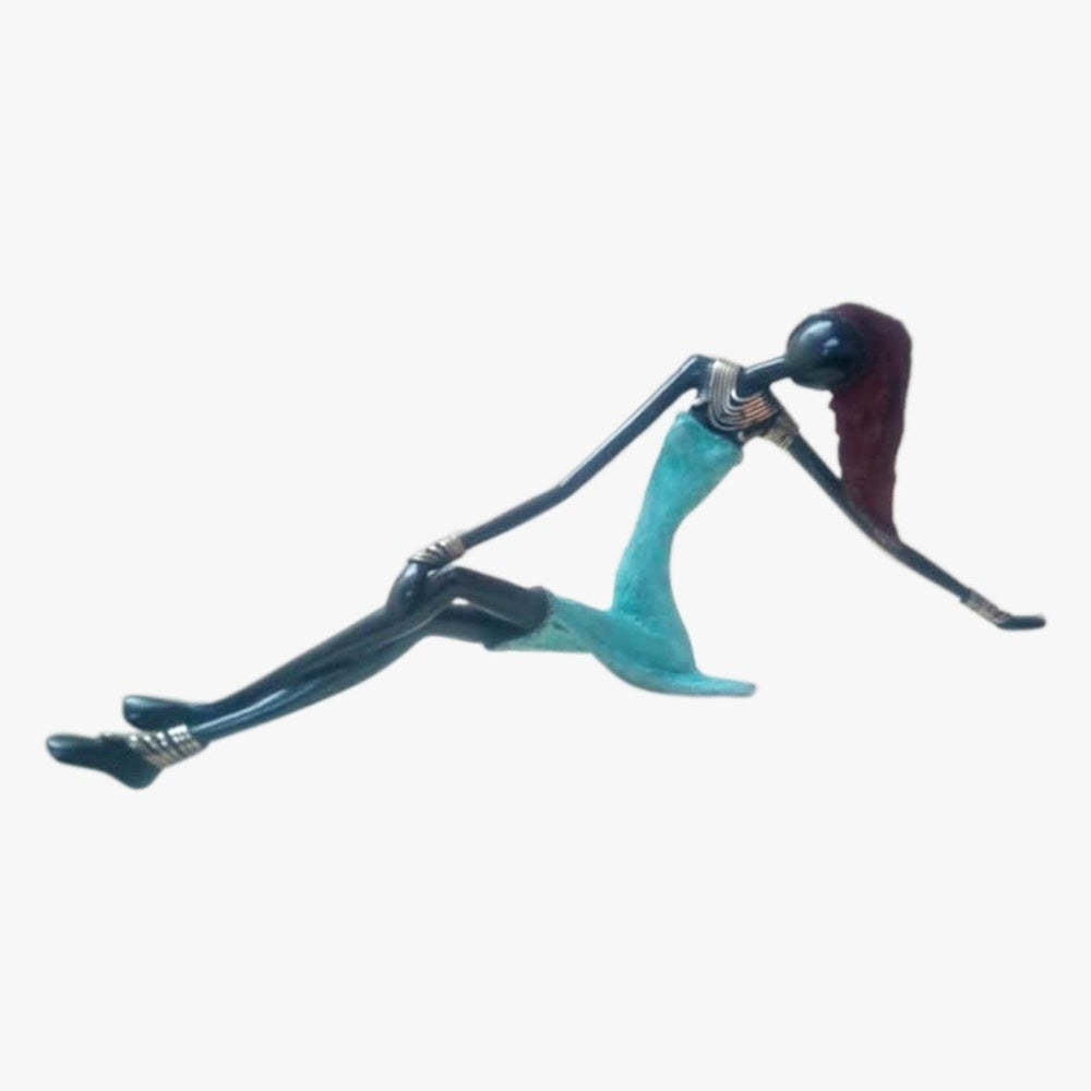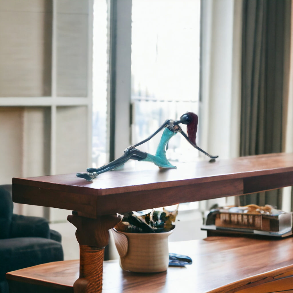 An exquisite vintage hand cast solid bronze exotic female statue of an African woman in a sky blue dress, This figurine is an unconventional representation of a modern African woman, showing elegance and style. It salutes the transforming spirit of Africa, focused on the development of women in all fields.