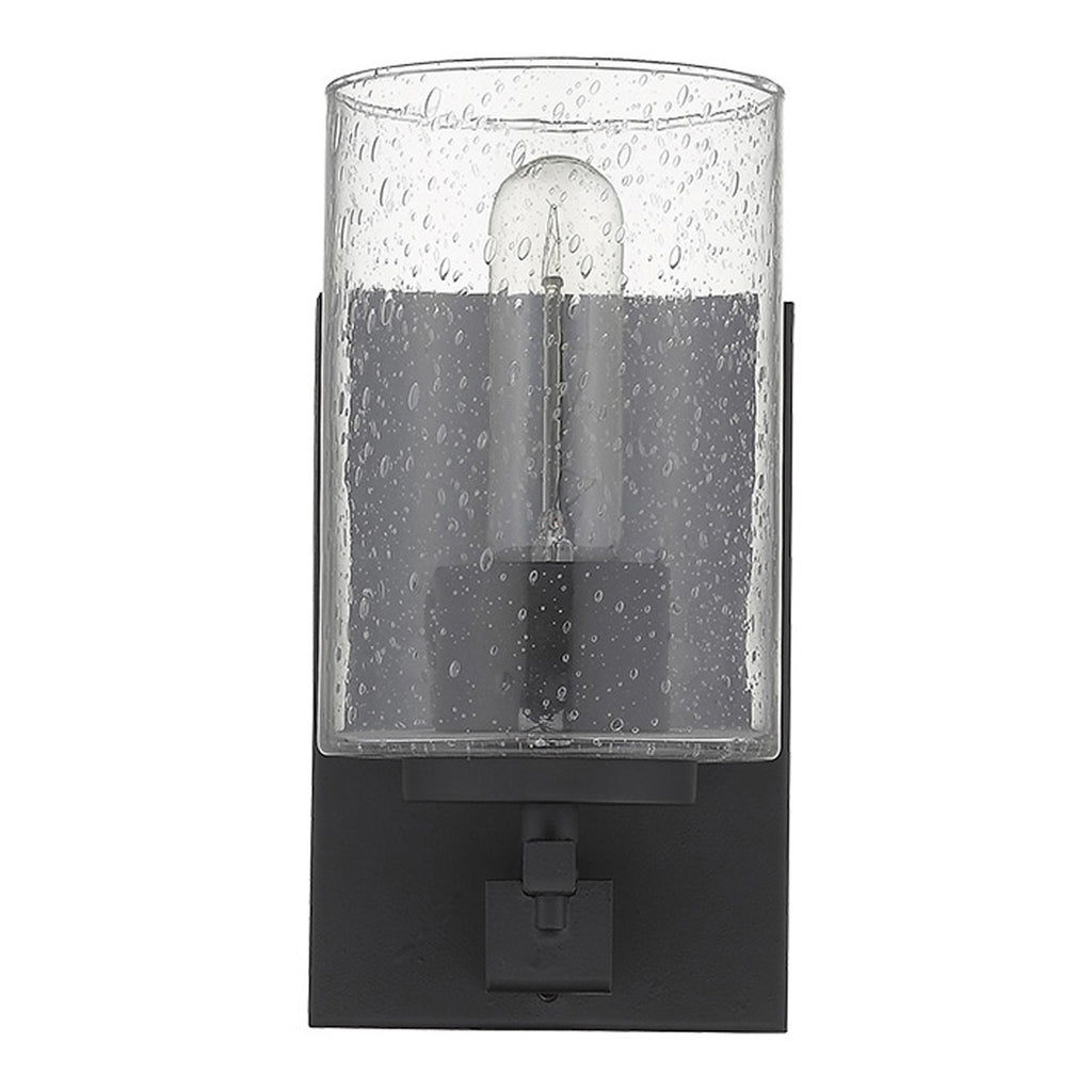 With this Black Metal and Textured Glass Wall Sconce you add some style and brightness to any space in your home. The wall bracket has a rectangular shape and a black finish on it. There is a horizontal rod attached to the wall bracket which holds the light up. The light shade is made of solid glass which has a rain drop textured effect on it. The contrast between the black metal hardware and textured glass shade gives this wall sconce a very unique look. You can use this wall sconce in your hallway, your living room, or in your kitchen. 8.75" H x 4.5" W x 5.75" D
