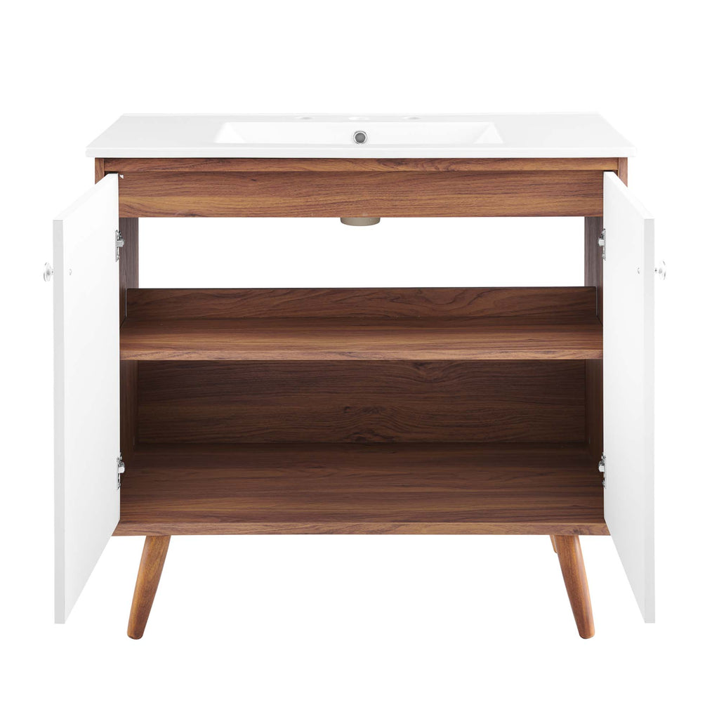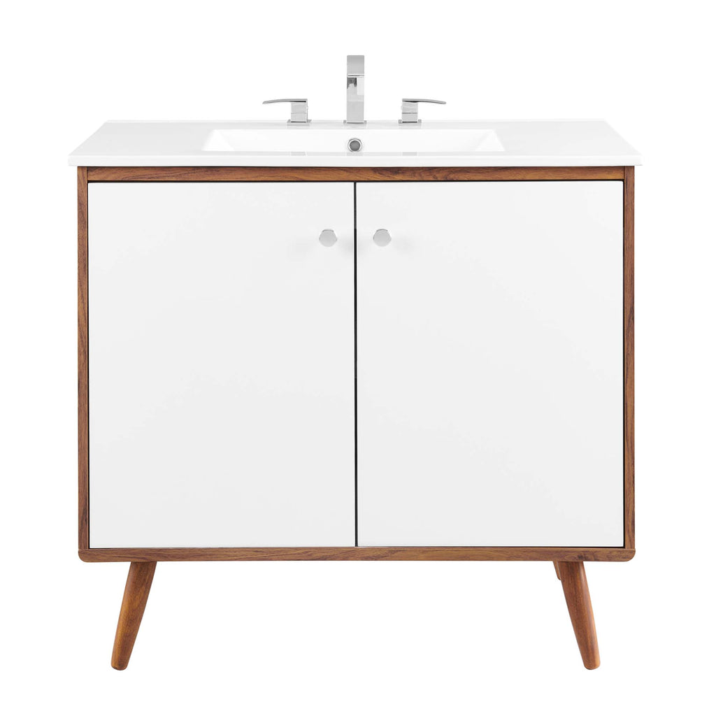Bring mid-century modern aesthetics into the bathroom with the Transmit 36" Bathroom Vanity. This vanity features a durable particleboard and walnut grain veneer construction with ample storage space for all your bathroom essentials behind two white lacquered soft-close hinged doors. A ceramic sink with an integrated countertop, 8" centerset, and rectangular sink basin continue the sleek look of this retro modern vanity. Complete with chrome knobs, this bathroom vanity rests atop four splayed wood legs. Assembly required and sink fixtures not included. Set Includes: One - Transmit 36" Bathroom Vanity