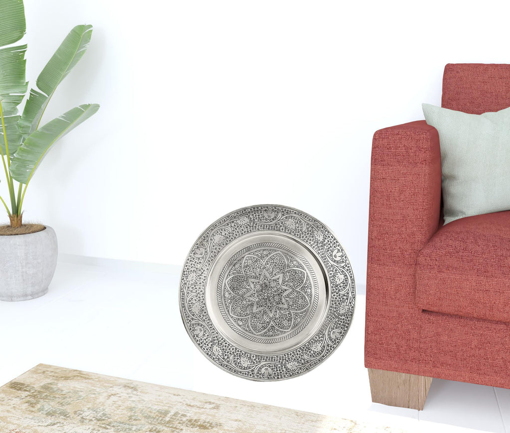 Distinctive in style the 14" black and silver aluminum round end table radiates a versatile charm. A black iron frame is finished off with a silver aluminum top that is the epitome of quality construction and design. The purposefully distressed finish gives this table an authentically rustic feel. Side tables are a great way to flank your sofa, use as an accent next to your favorite chair, or can even be used bedside. This versatile table is a great accent for most any room. 14" H x 16" W x 16" D