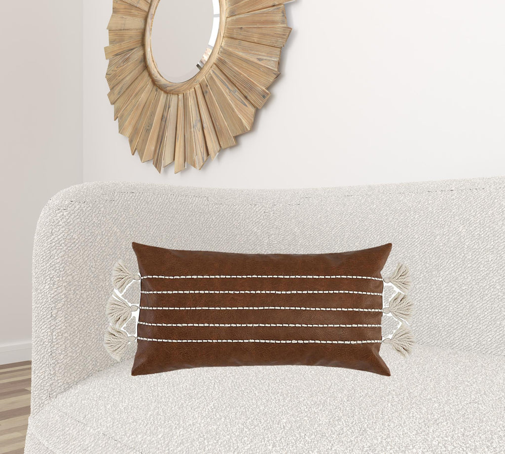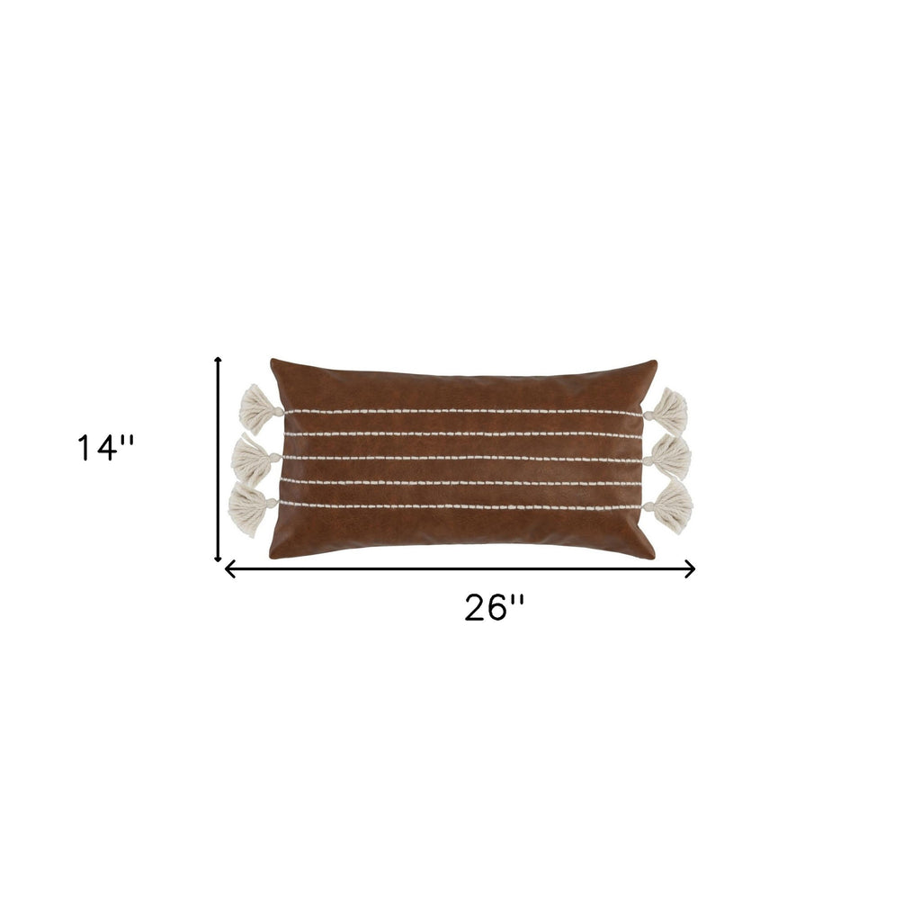 14" X 26" Brown Faux Leather Zippered Pillow With Tassels