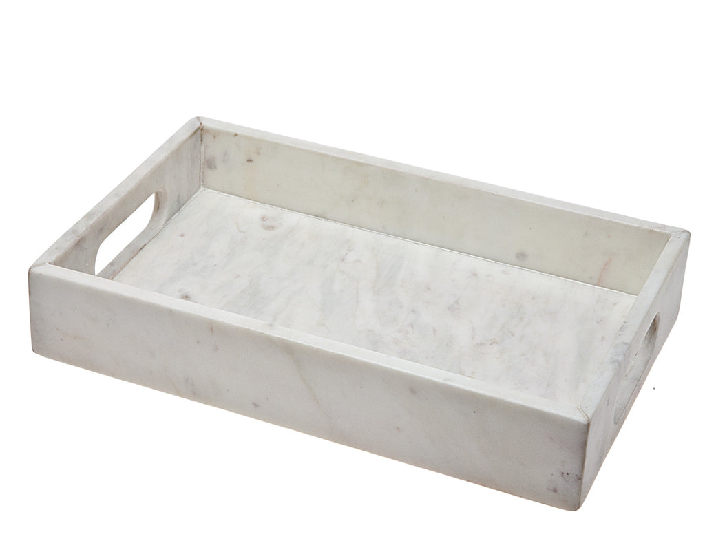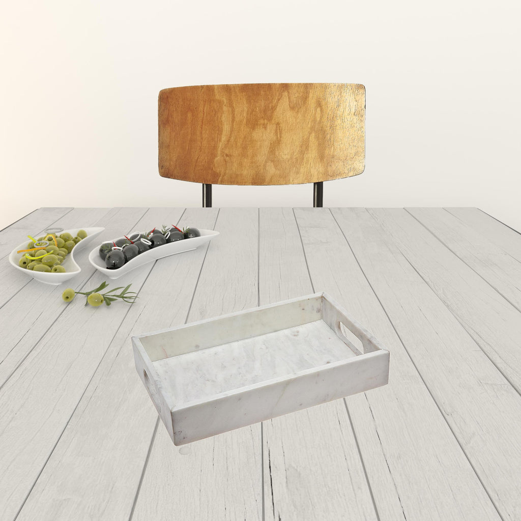 This 16" white rectangular marble serving tray with handles is a handy and versatile addition to your home. This rectangular serving tray has all the beauty and functionality of one of nature's loveliest materials. Visually impressive with the exquisitely veined texture of genuine marble, this piece is a gorgeous and practical serving and entertaining accent. Designed with handles for easy transport and convenience. Food safe and versatile, this serving tray is sure to please. 2.15" H x 16" W x 12" D