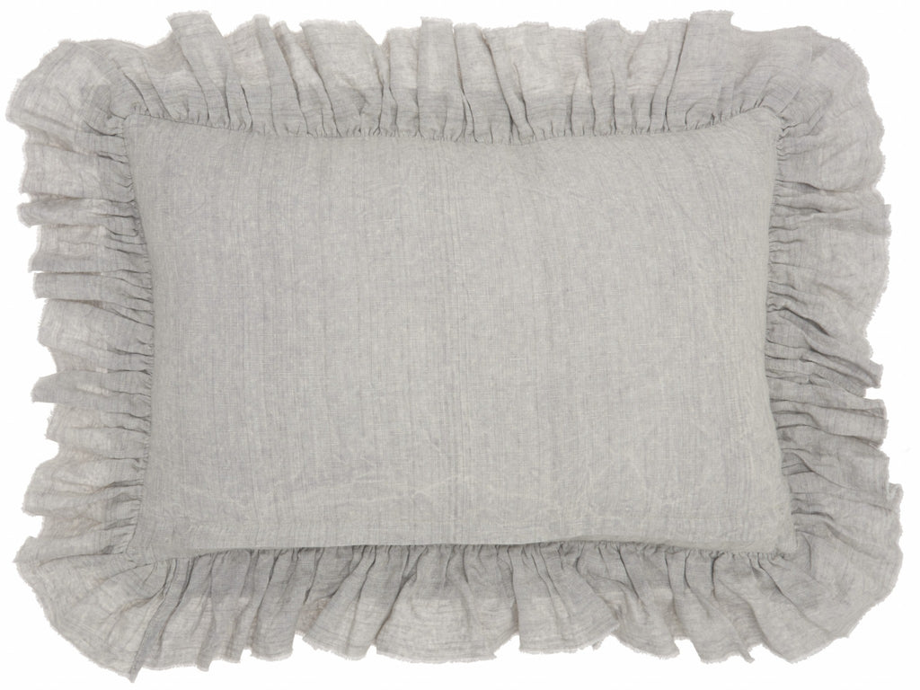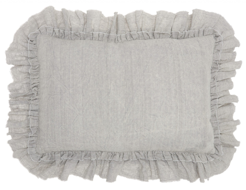 The perfect way to add some charm to your space, this 16-inch x 24-inch gray pillow with ruffled edges is a great decorative accent. Crafted to match with the softer design elements in your home, this pillow is covered in a soft slightly textured fabric which has a warm gray color. Around the edges of the throw pillow there are two layers of ruffles adding a touch of depth to the overall look. A great decorative accessory for your favorite chair, to accent your sofa, or to use as part of your bed ensemble. 16-inch H x 24-inch W x 5-inch D