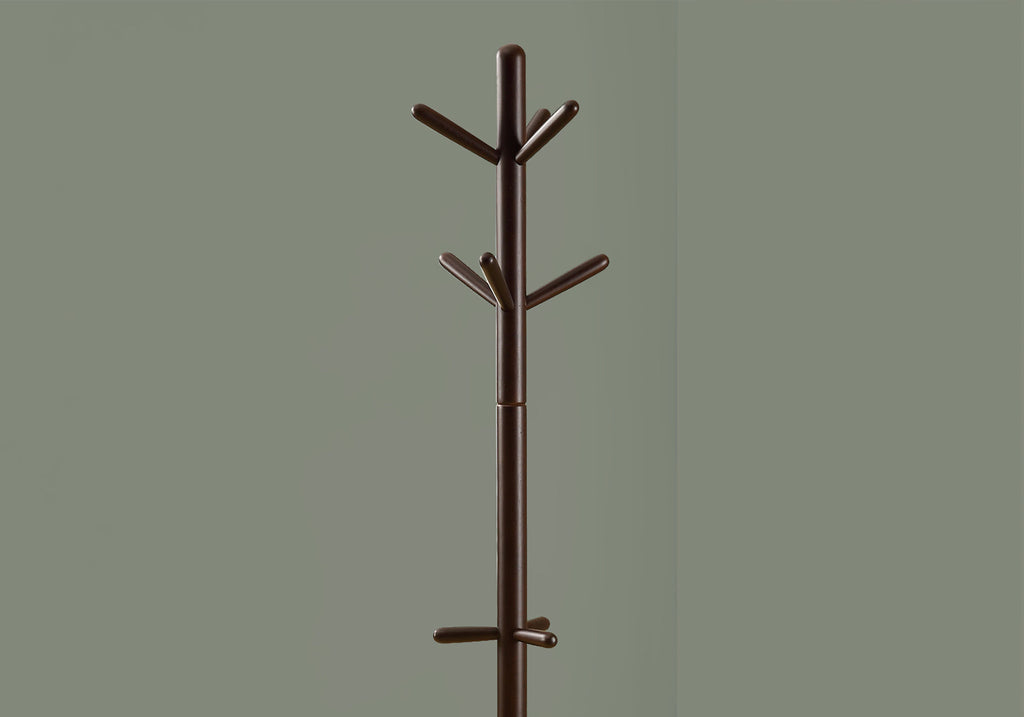Organize your home with this contemporary solid wood coat rack. A beautiful lustrous cappuccino finish and a sturdy pedestal base bring plenty of stylish storage into your living space. The simplicity of the design makes it easy to create functionality in