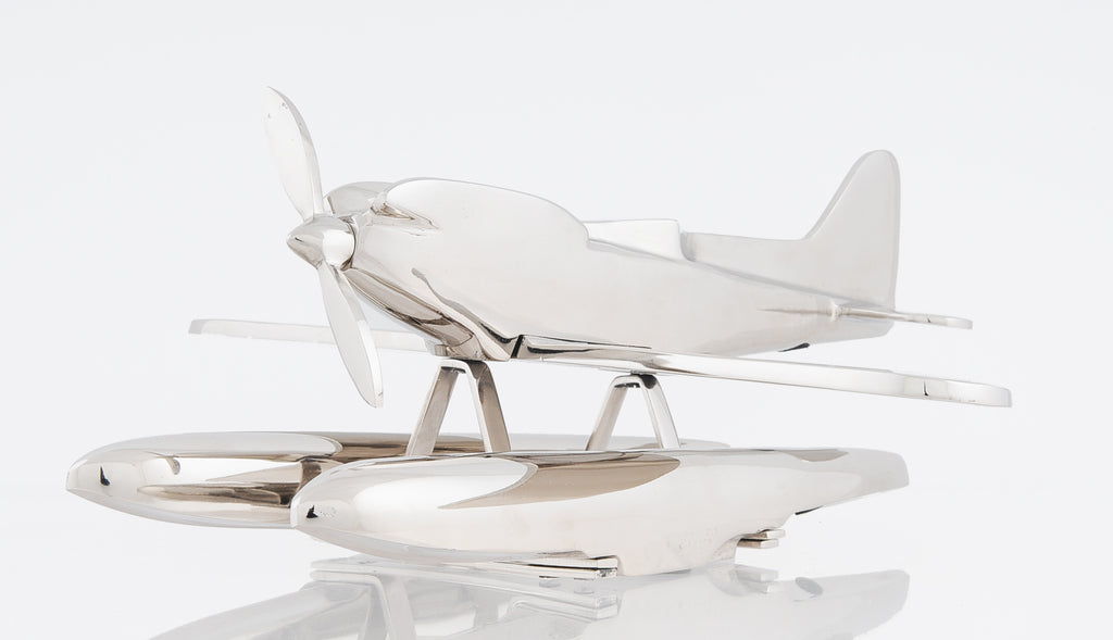 A flying machine that could breeze through the clouds but also cruise along the shore became an innovative reality early in the 18th century. This aluminum seaplane will build rapport on the office desk or make a glistening decorative piece in the home. ? Made out of aluminum with a shiny nickel finish ? Propeller spins