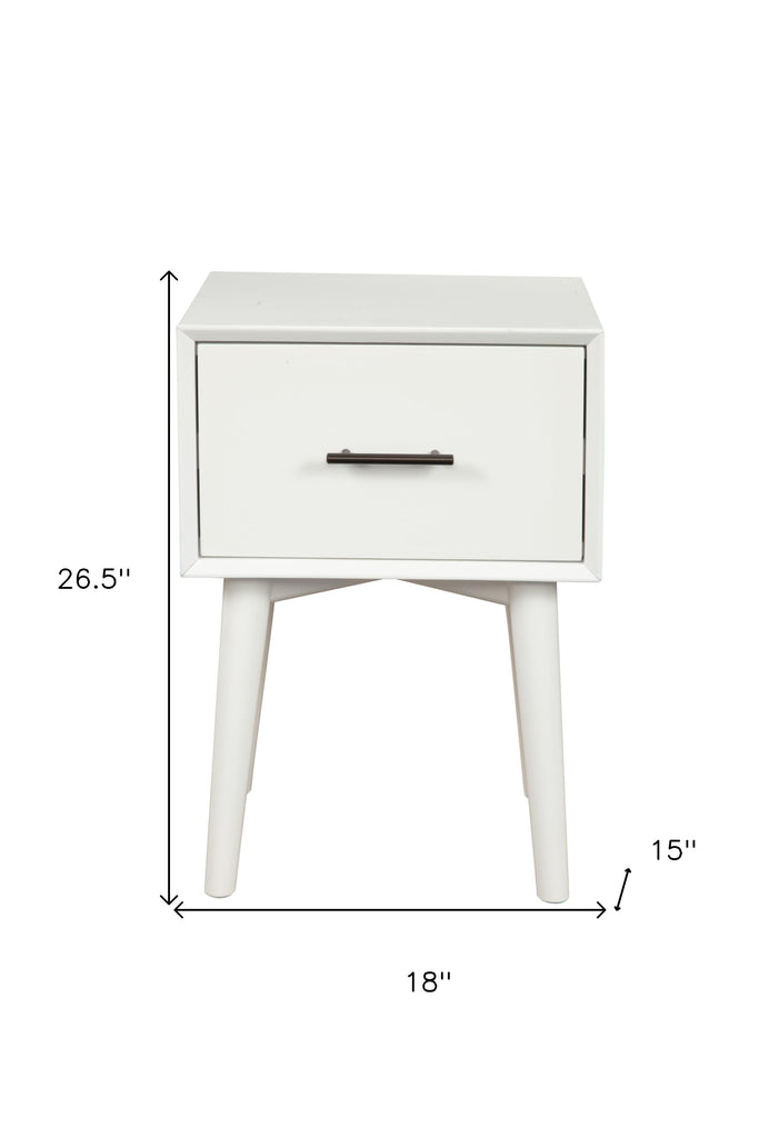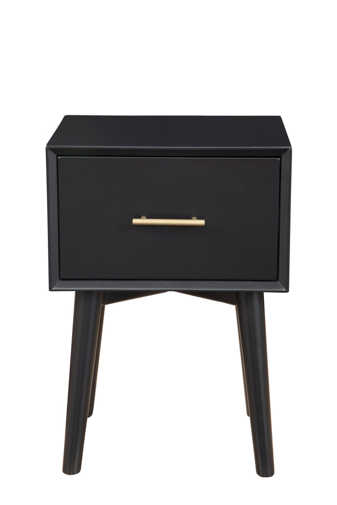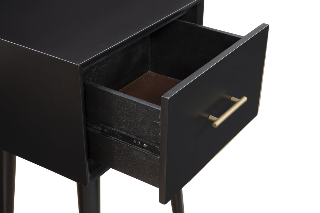 Optimize your space and add some charm to your room with the 18" black mid century mod wood end table with drawer. Made of a mix of solid and manufactured woods/veneers, the black coloration throughout gives this piece an updated and refreshing look. Includes a single, felt lined, easy pull out drawer for handy storage of life's little essentials. An ideal location for placing your snacks and drinks, and a place to keep your lamp, frames, or other accessories. Gold drawer pull offsets the piece and gives it a glam look. 26.5" H x 18" W x 15" D