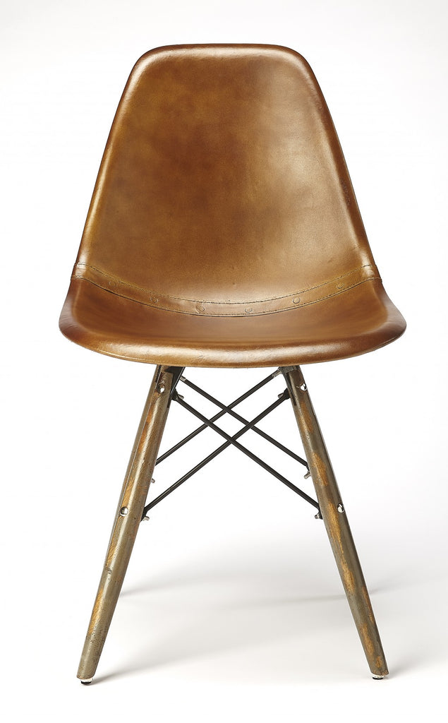 This 18" brown and copper faux leather side chair will add a beautiful decorative accent to your decor. Built to last this side chair is finished in brown faux leather to give your room a great update. The sturdy inner frame is built with high quality solid + manufactured wood, featuring a tight back that is accented with soft and comfortable cushioning. 32" H x 18" W x 16" D
