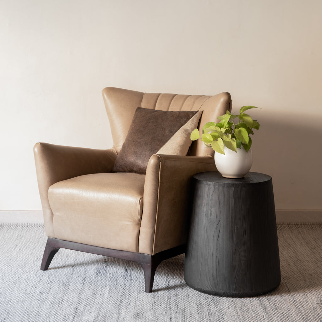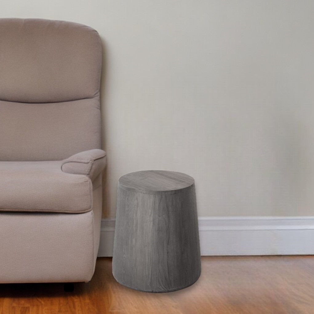 Distinctive in style the 18" ebony solid wood round end table with radiates a versatile charm. This table features quality construction from solid wood and an updated monotone color scheme with ebony as the main color on both the top and the base. Complete with a purposefully distressed finish, this table has an aged, vintage, and rustic feel. A great accent on either side of the sofa or bed, this adorable end or side table is just what you need. With a round top surface that is tapered at the top and wider at the bottom, this versatile table is a great accent for most any room. 18.2" H x 16.5" W x 16.5" D