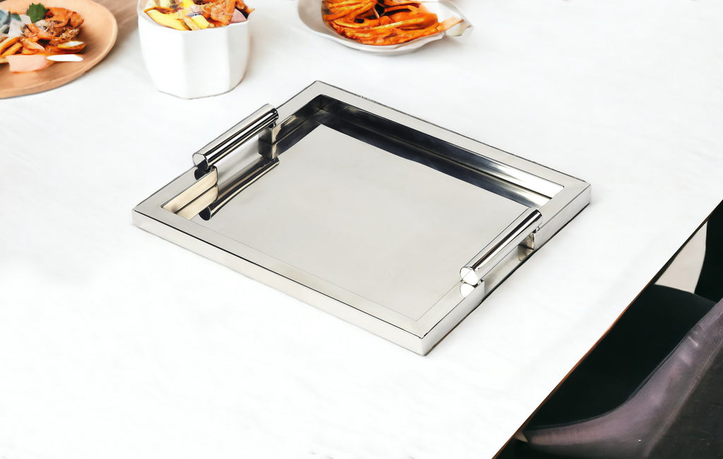 Accessorize your home with this modern silver stainless steel serving tray. It's glazed-like mirror steel finish is perfectly paired with cylindrical bar handles on either side to make it easy to carry and enhance its appearance making it ultra vogue. Add a touch of class on anything that you serve with this tray. Good looking to sit out all year round. A great tray for coffee table or ottoman. 2-inch H x 17.5-inch W x 15-inch D