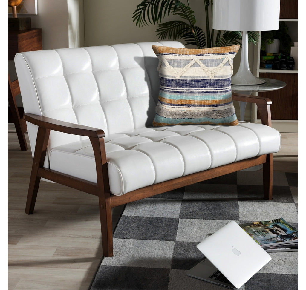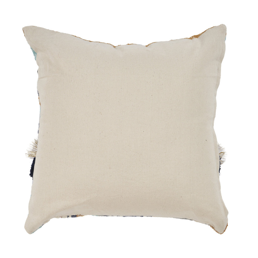 The 18-inch x 18-inch blue and beige patchwork cotton zippered pillow with tassels is the perfect decorative accessory for your home. Soft and textural blue and beige 100% cotton has been used to make this pillow look and feel like a real treasure. Fun and decorative tassels add some high end and hand-crafted textural designer touches. Super soft and built to hold its shape, this polyfill pillow is a great option. For anyone that loves to decorate or accent their space with color and texture. Decorative pillows are a great way to change up the look and feel of your space easily and quickly. 18-inch H x 18-inch W x 6-inch D