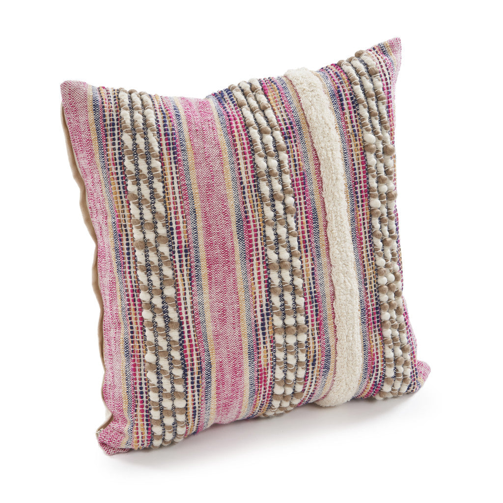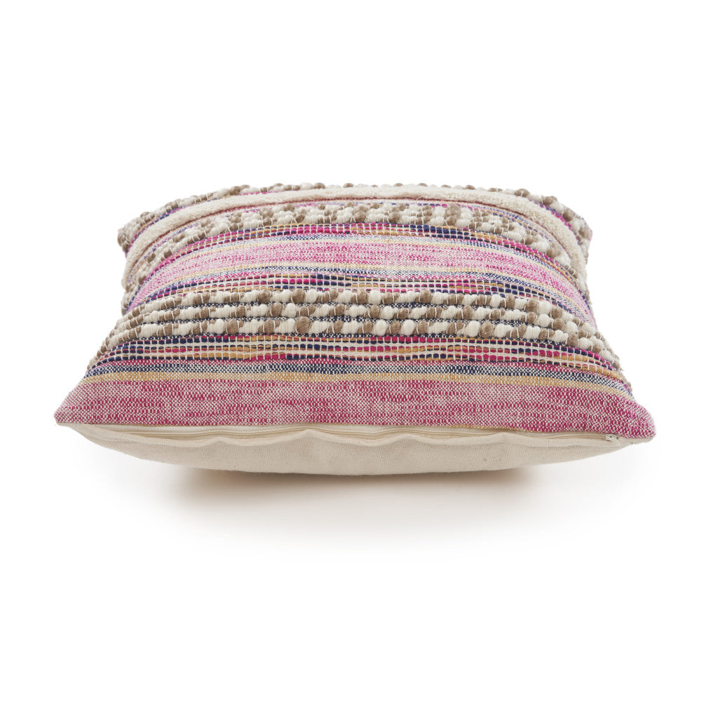 Unique and decorative, this comfortable 18-inch x 18-inch pink and ivory striped cotton blend zippered pillow will leave a lasting impression. This soft and durable decorative pillow is expertly made of high grade, long lasting cotton blend in a pink and ivory coloration. This soft polyfill pillow not only is decorative but made to be comfy and cozy all day long. Great to use on its own or mix with other decorations for the perfect look. A great decorative accessory for your favorite chair, to accent your sofa, or to use as part of your bed ensemble. 18-inch H x 18-inch W x 6-inch D