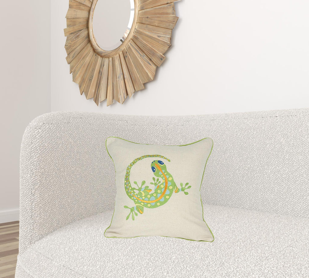 18"x18" Beige and Green Lizard Linen Blend Zippered Pillow With Embroidery