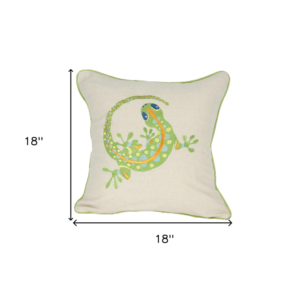 Add an air of fashion to your room and rejuvenate the space with this cute and fashionable 18-inchx18-inch beige and green lizard linen blend zippered pillow with embroidery. This soft and durable decorative pillow is expertly made of high grade, long lasting linen blend in a beige and green coloration. Great to use on its own or mix with other decorations for the perfect look. A great decorative accessory for your favorite chair, to accent your sofa, or to use as part of your bed ensemble. 18-inch H x 18-inch W x 6-inch D