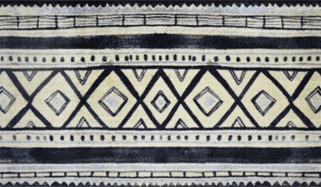 This low profile Black and Gray Tribal Washable Floor Mat is a game changer. A fade resistant slightly distressed modern black, white, tan and gray geometric tribal design that is a fashion forward look for a mat that is super sturdy and can easily be thrown into the washer and dryer to clean. The premier formula rubber backing used makes this nylon rug slip resistantr with no need for an additional pad, and the backing will hold up during the wash and dry! The low profile means it easily fits under doors. Combine fashion and style with real life functionality with this great area rug/door mat. 27.5" x 47" x .3"