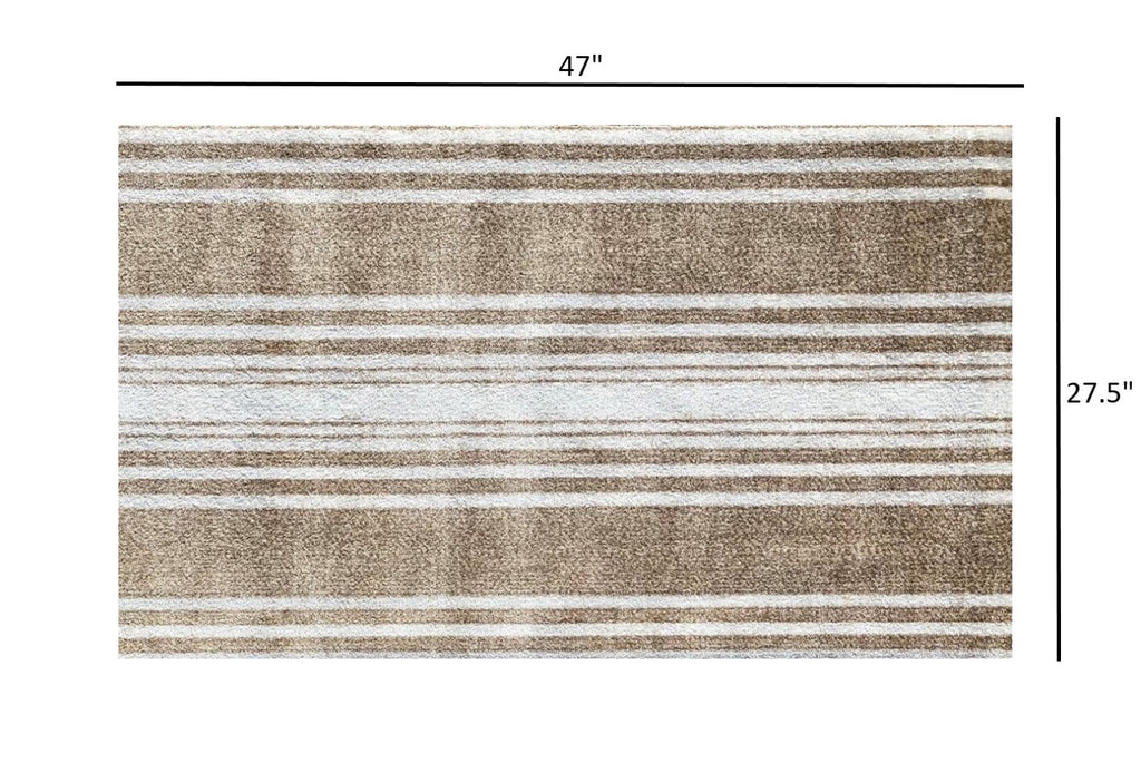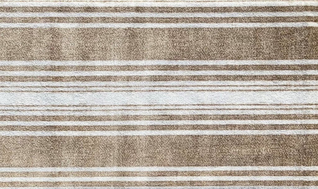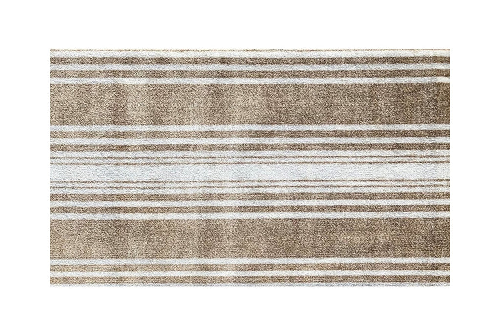 This low profile Sandy Shores Regatta Stripe Washable Floor Mat is a game changer. A fade resistant slightly distressed varigated regatta stripe design in multi shades of sandy tan, ivory and white that is a fashion forward look for a mat that is super sturdy and can easily be thrown into the washer and dryer to clean. The premier formula rubber backing used makes this nylon rug slip resistantr with no need for an additional pad, and the backing will hold up during the wash and dry! The low profile means it easily fits under doors. Combine fashion and style with real life functionality with this great area rug/door mat. 27.5" x 47" x .3"