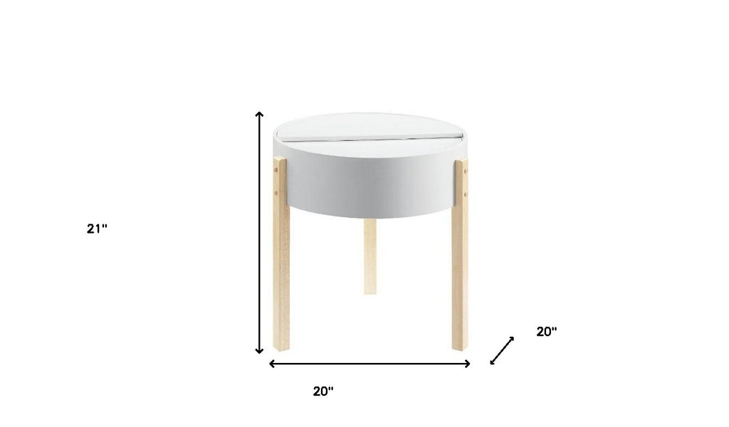 Distinctive in style the 21" natural brown and white manufactured wood and solid wood round end table radiates a versatile charm. The base of this table is made from solid wood in a natural brown color that is a nice contrast to the white manufactured wood tabletop. A great accent on either side of the sofa or bed, this adorable end or side table is just what you need. This versatile table is a great accent for most any room. 21" H x 20" W x 20" D
