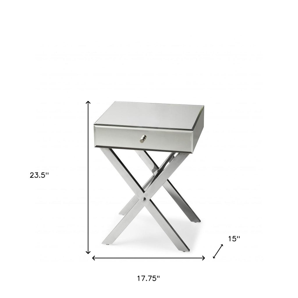 Show off your exquisite taste with this 21" silver geo base and glass round end table. The silver coloration runs throughout the base of this modern geometric stainless steel and glass table. Complete with a purposefully distressed finish, this table has an aged, vintage, and rustic feel. An ideal location for placing your snacks and drinks, and a place to keep your lamp, frames, or other accessories. You can match it with other pieces to get the ideal look for your place. 21.25" H x 15.5" W x 15.5" D