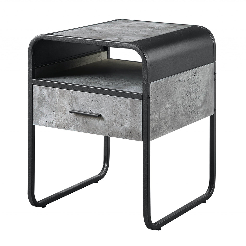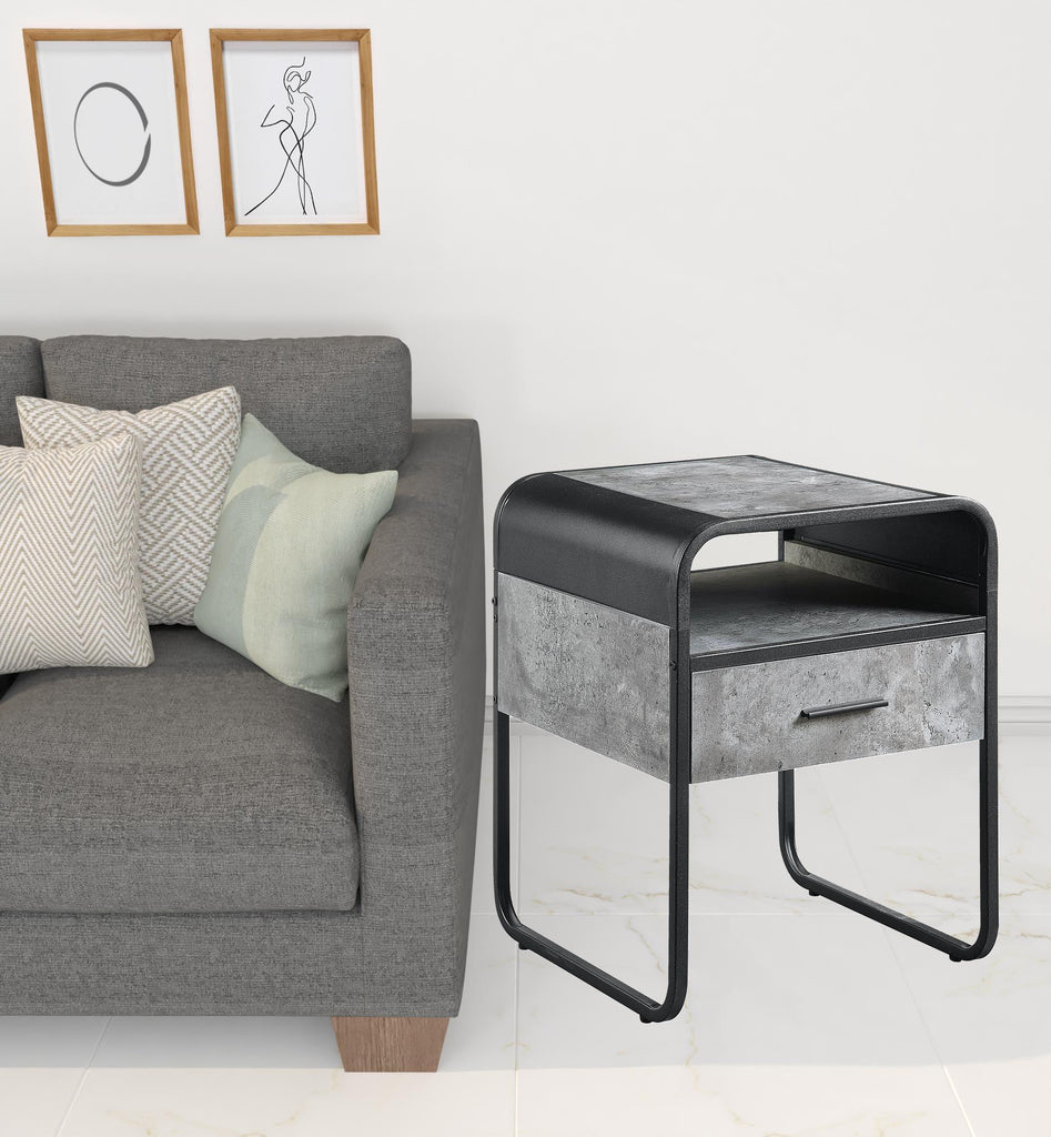 Show off your exquisite taste with this 22" black and concrete gray manufactured wood and metal square end table with drawer and shelf. The base of this table is made from metal in a black color that is a nice contrast to the concrete gray manufactured wood tabletop. Help to keep your space organized with the included single shelf. Includes a single easy pull out drawer for handy storage of life's little essentials. An ideal location for placing your snacks and drinks, and a place to keep your lamp, frames, or other accessories. You can also use it as an entryway table to hold your keys. 22" H x 18" W x 18" D