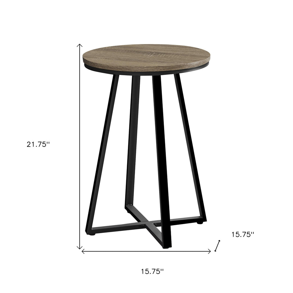 Optimize your space and add some charm to your room with the 22" black and dark taupe round end table with. The base of this table is made from metal in a black color that is a nice contrast to the dark taupe manufactured wood tabletop. Side tables are a great way to flank your sofa, use as an accent next to your favorite chair, or can even be used bedside. This versatile table is a great accent for most any room. 21.75" H x 15.75" W x 15.75" D