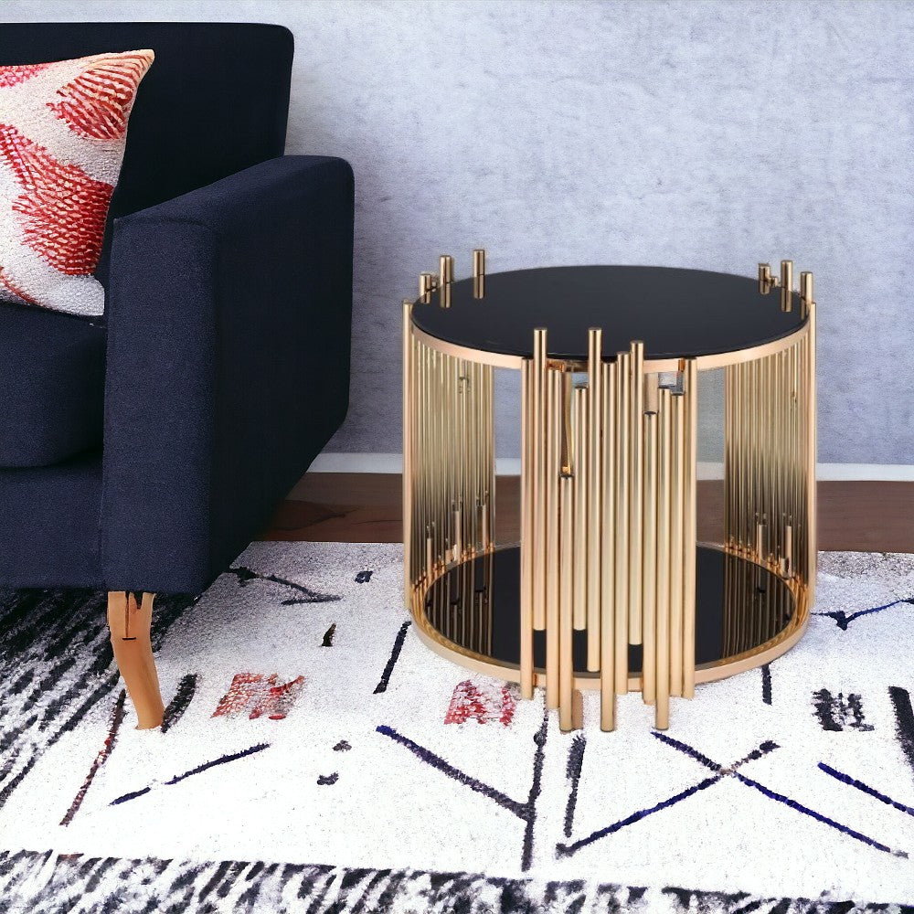 The base of this table is made from iron in a gold color that is a nice contrast to the black glass tabletop. Includes a single shelf for handy storage or display space. Side tables are a great way to flank your sofa, use as an accent next to your favorite chair, or can even be used bedside. You can also use it as an entryway table to hold your keys. 22" H x 25" W x 25" D