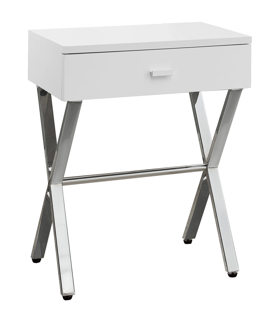 Distinctive in style the 22" silver and white end table with drawer radiates a versatile charm. The silver coloration of the high quality metal base marries nicely with the white manufactured wood top. Includes a single easy pull out drawer for handy storage of life's little essentials. An ideal location for placing your snacks and drinks, and a place to keep your lamp, frames, or other accessories. You can match it with other pieces to get the ideal look for your place. 22.25" H x 12" W x 18.25" D