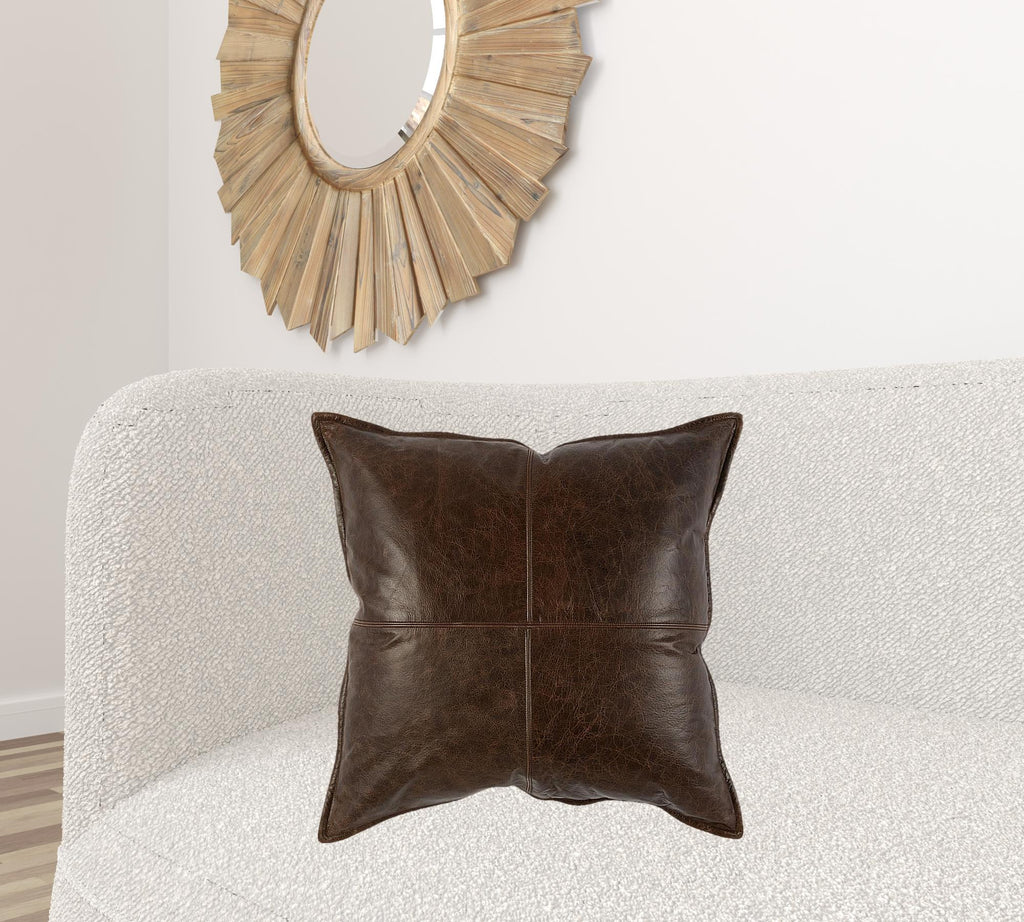 The perfect complement to your sofa, favorite chair, or bed, this 22" x 22" brown leather zippered pillow is a great decorative accent. The luxurious brown coloring of the genuine leather will add dimension and texture to your space. Elegantly chic, this pillow is the epitome of luxury. Great to use on its own or mix with other decorations for the perfect look. Decorative pillows are a great way to change up the look and feel of your space easily and quickly. 22" H x 22" W x 5" D
