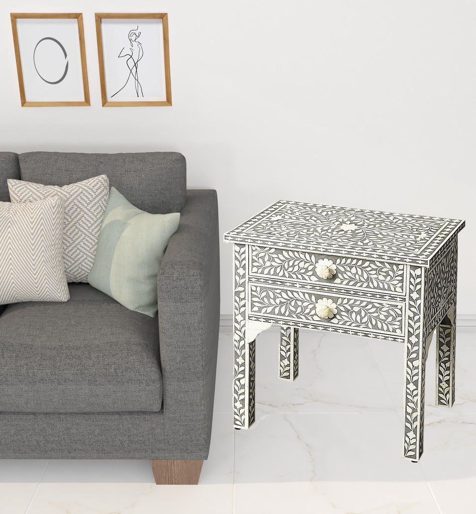 Show off your exquisite taste with this 23" gray manufactured wood rectangular end table with two drawers. Made of manufactured wood, the gray coloration throughout gives this piece an updated and refreshing look. Complete with a purposefully distressed finish, this table has an aged, vintage, and rustic feel. Includes 2 easy open drawers for storage of the small essentials. An ideal location for placing your snacks and drinks, and a place to keep your lamp, frames, or other accessories. You can match it with other pieces to get the ideal look for your place. 22.5" H x 21.38" W x 14.25" D