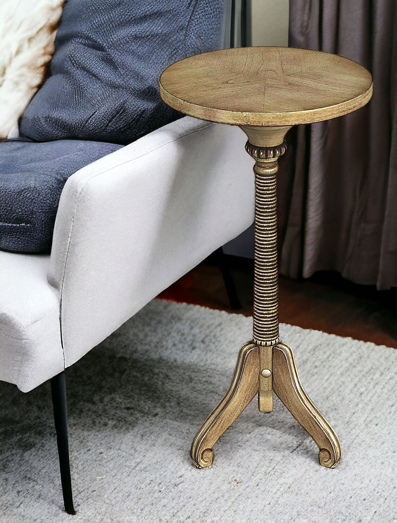 Show off your exquisite taste with this 24" beige manufactured wood round end table. A solid beige solid and manufactured wood frame is finished off with a matching beige manufactured wood seat, giving this table a chic monotone look. Complete with a purposefully distressed finish, this table has an aged, vintage, and rustic feel. A great accent on either side of the sofa or bed, this adorable end or side table is just what you need. This versatile table is a great accent for most any room. 24" H x 12" W x 12" D