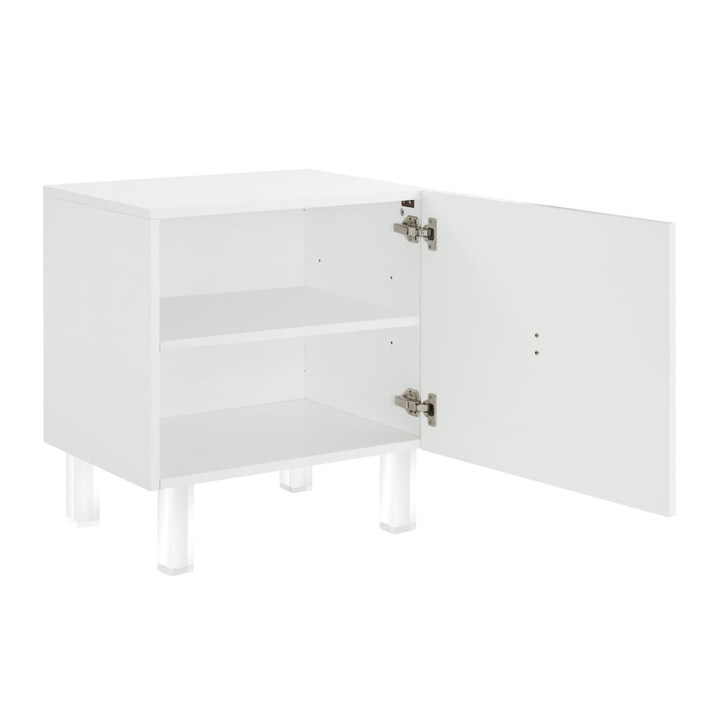 Distinctive in style the 24-inch clear and white end table / accent cabinet with two shelves radiates a versatile charm. The body of this manufactured wood table is white, while the legs are a modern compliment in clear lucite. There are 2 shelves that will help to keep clutter at bay. Side tables are a great way to flank your sofa, use as an accent next to your favorite chair, or can even be used bedside. You can match it with other pieces to get the ideal look for your place. 24-inch H x 24-inch W x 18-inch D