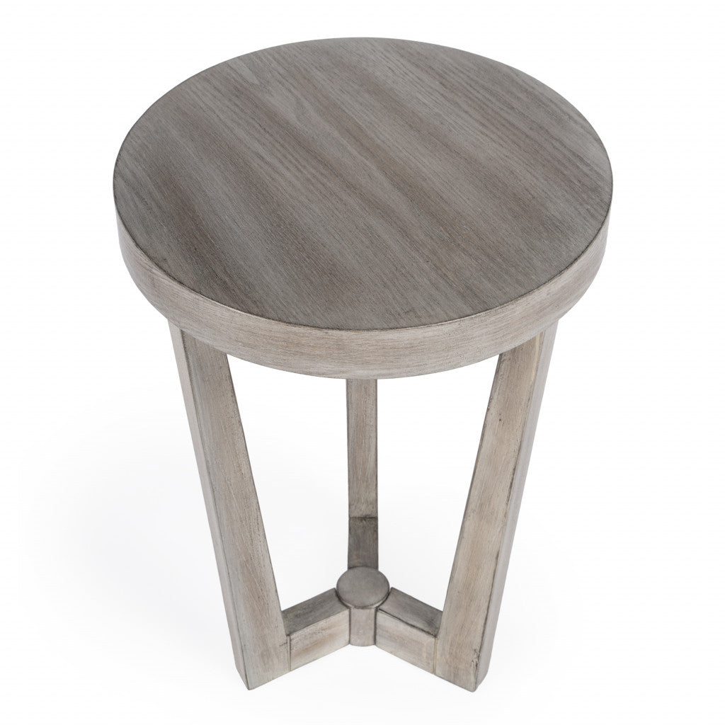 Show off your exquisite taste with this 24" gray manufactured wood round end table. A solid gray solid wood frame is finished off with a matching gray manufactured wood seat, giving this table a chic monotone look. Complete with a purposefully distressed finish, this table has an aged, vintage, and rustic feel. Side tables are a great way to flank your sofa, use as an accent next to your favorite chair, or can even be used bedside. This versatile table is a great accent for most any room. 24" H x 16" W x 16" D