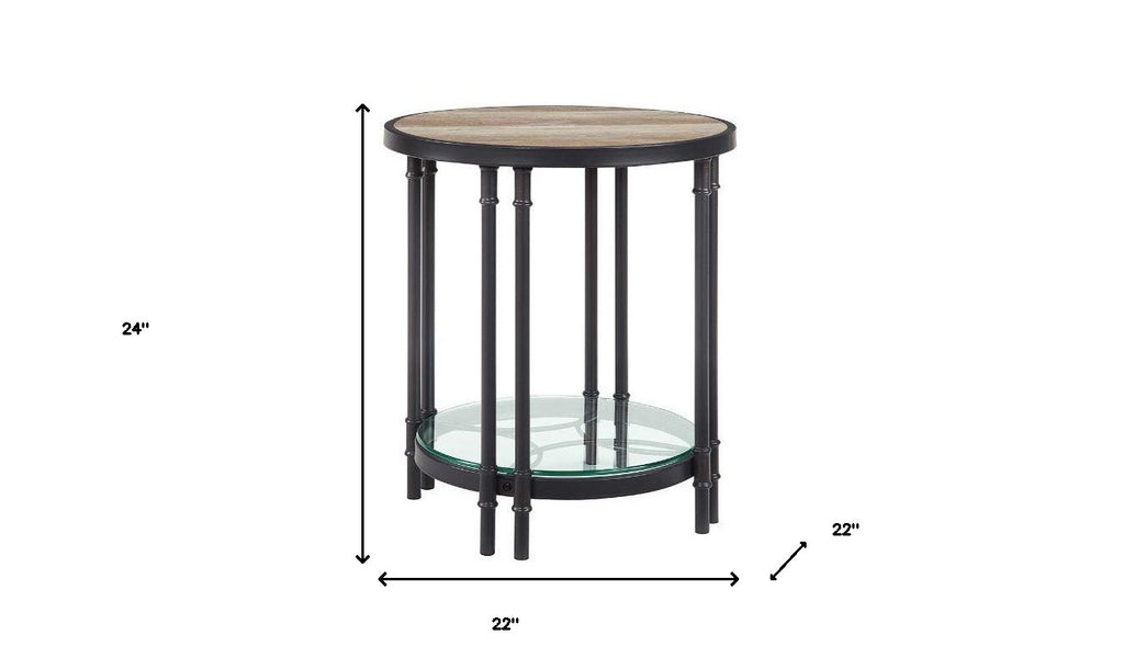 Distinctive in style the 24" sandy black and oak manufactured wood and metal round end table with shelf radiates a versatile charm. Quality construction from the sandy black metal base combines with oak manufactured wood of the top to give this table a fresh and updated look. Help to keep your space organized with the included single shelf. A great accent on either side of the sofa or bed, this adorable end or side table is just what you need. You can also use it as an entryway table to hold your keys. 24" H x 22" W x 22" D