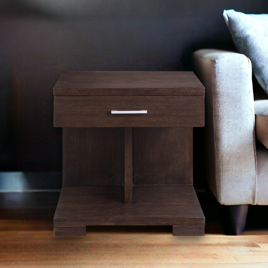 Show off your exquisite taste with this 24" walnut manufactured wood square end table with drawer and shelf. This table is made from manufactured wood in a walnut color throughout the base and top. Help to keep your space organized with the included single shelf. Includes a single easy pull out drawer for handy storage of life's little essentials. Side tables are a great way to flank your sofa, use as an accent next to your favorite chair, or can even be used bedside. You can also use it as an entryway table to hold your keys. 24" H x 24" W x 28" D