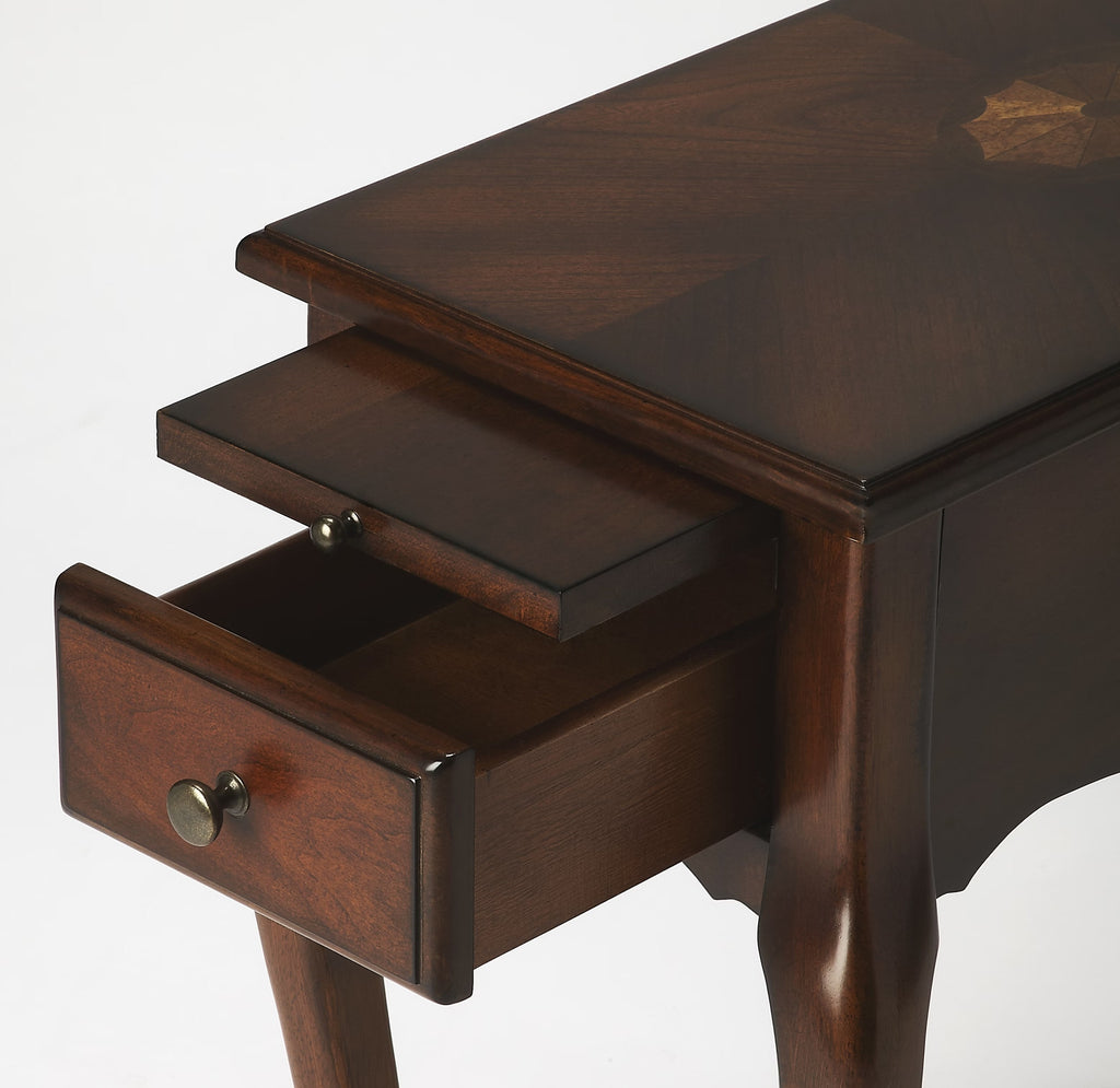 Distinctive in style the 25" cherry brown solid and manufactured wood rectangular end table with drawer radiates a versatile charm. A sleek cherry brown monotone color gives this solid wood and solid and manufactured wood table a fresh and updated look. Complete with a purposefully distressed finish, this table has an aged, vintage, and rustic feel. Includes a single easy pull out drawer for handy storage of life's little essentials. An ideal location for placing your snacks and drinks, and a place to keep your lamp, frames, or other accessories. You can also use it as an entryway table to hold your keys. 24.5" H x 11.5" W x 23.5" D
