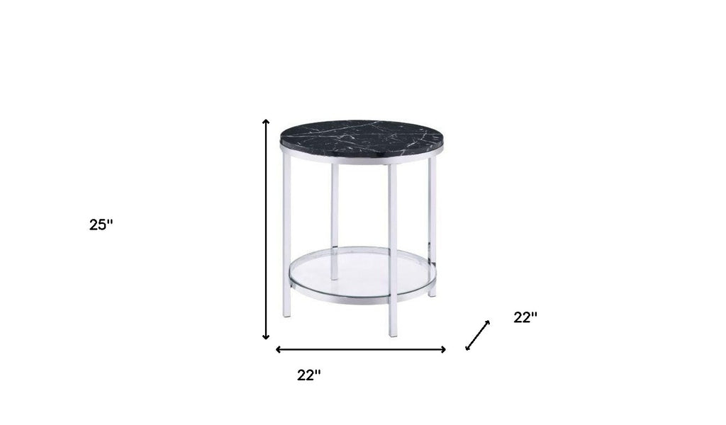25" Chrome And Black Faux Marble And Metal Round End Table With Shelf