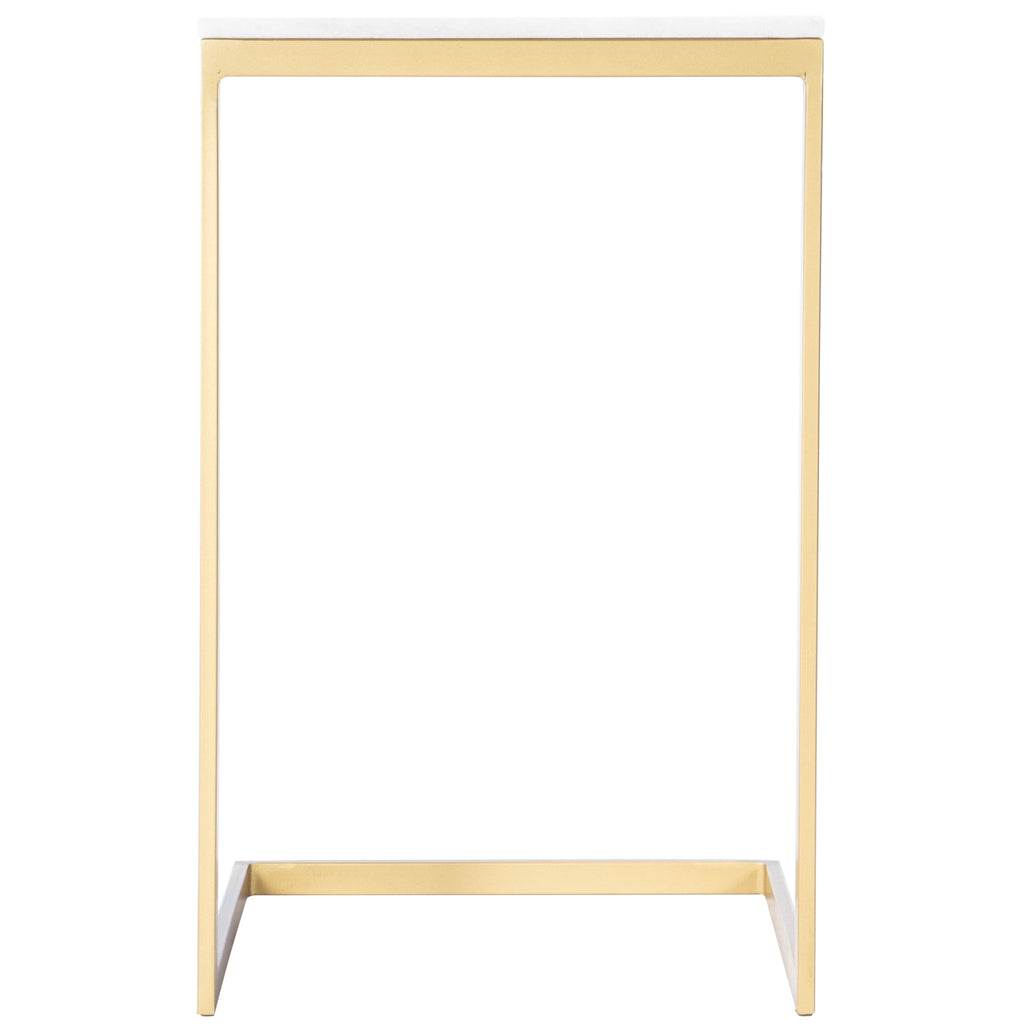 Distinctive in style the 26" gold and white marble square end table radiates a versatile charm. A sleek antiqued gold color gives this iron and white marble table a fresh and updated look. The C shape design makes it versatile to pull up to your lap on the sofa for eating or working space. Complete with a purposefully distressed finish, this table has an aged, vintage, and rustic feel. Side tables are a great way to flank your sofa, use as an accent next to your favorite chair, or can even be used bedside. You can also use it as an entryway table to hold your keys. 26" H x 16" W x 16" D