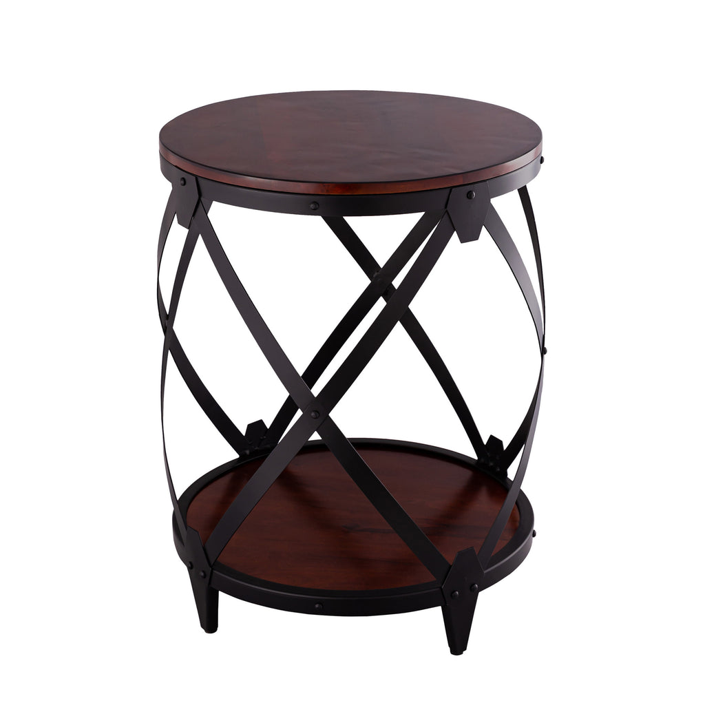 Distinctive in style the 26" black and chestnut solid wood round end table radiates a versatile charm. The chestnut solid wood top of this table is a nice contrast to the high quality, black iron of the base. An ideal location for placing your snacks and drinks, and a place to keep your lamp, frames, or other accessories. You can match it with other pieces to get the ideal look for your place. 26.25" H x 20" W x 20" D