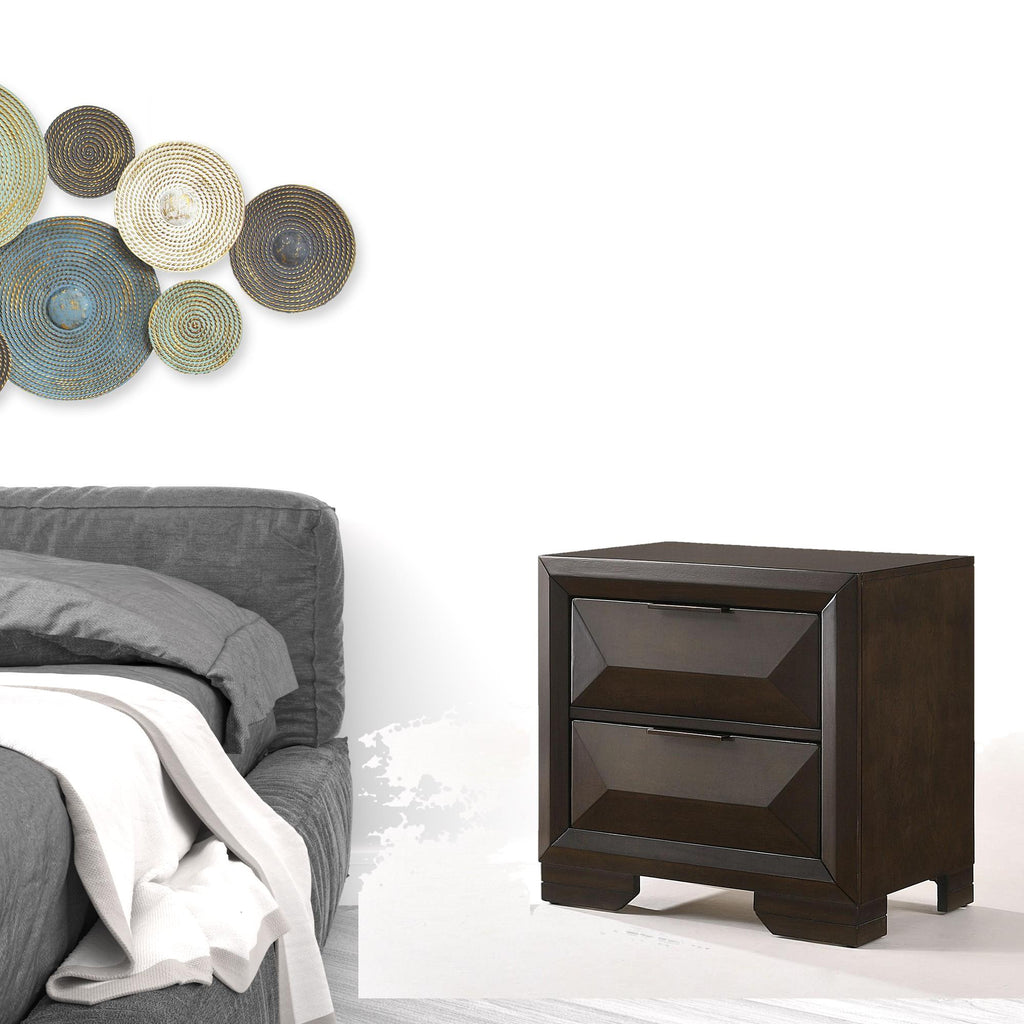 The 26" Rectangular Rubber Wood Nightstand With Solid Wood Top features 2 beveled front drawers with safety stop included, center metal glides and metal hardware for easy opening. Brilliantly designed, it has a rich warm espresso finish, which complements a modern, traditional as well as a cottage bedroom setting. Made of high quality materials, it demonstrates delicate craftsmanship and has the perfect design to enhance your room. 26" W X 17" D X 25" H