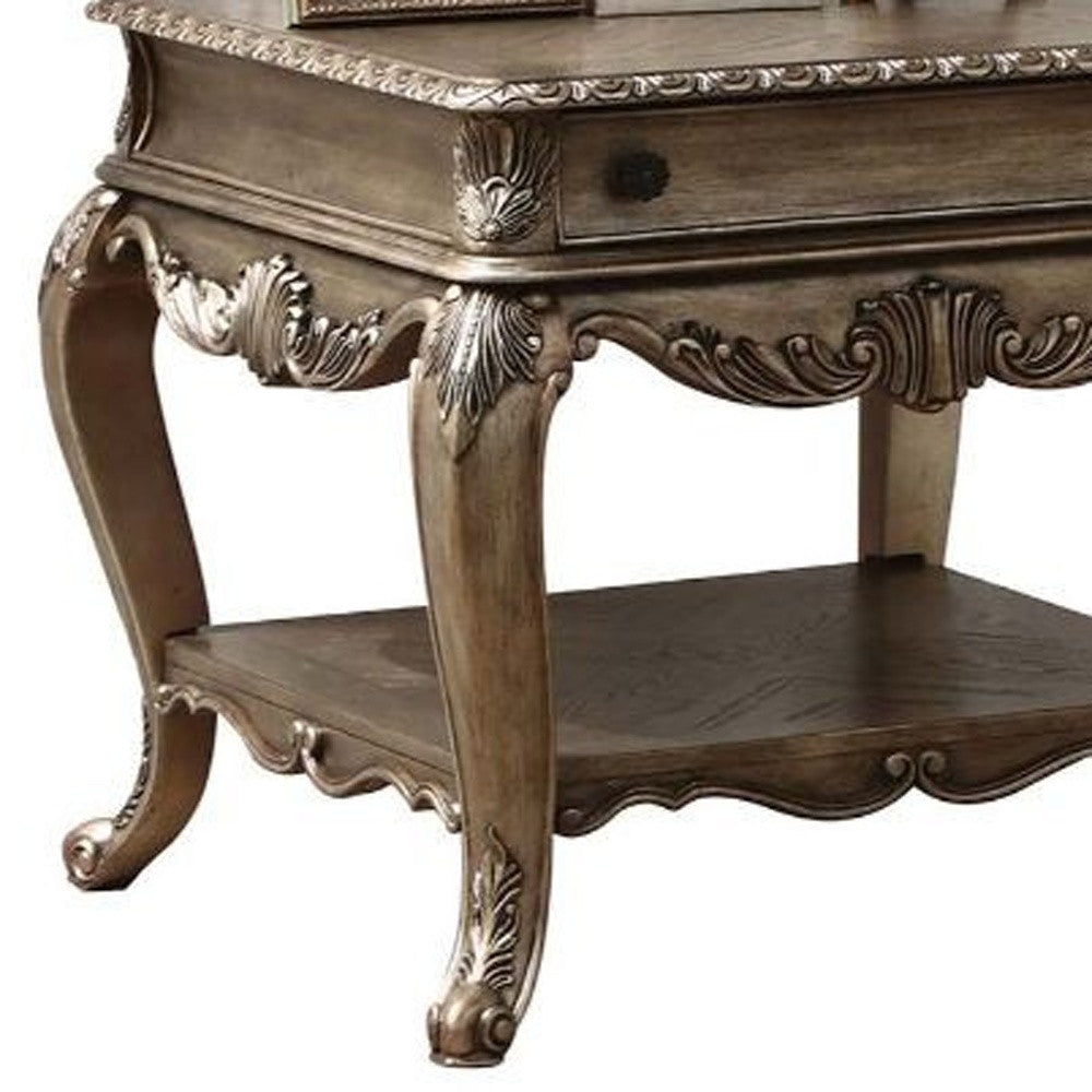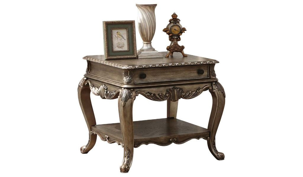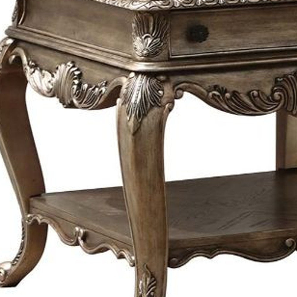 Optimize your space and add some charm to your room with the 26" vintage oak manufactured wood and polyresin rectangular end table with drawer and shelf. A sleek vintage oak monotone color gives this polyresin and manufactured wood table a fresh and updated look. Includes a single shelf for handy storage or display space. Includes a single easy pull out drawer for handy storage of life's little essentials. Side tables are a great way to flank your sofa, use as an accent next to your favorite chair, or can even be used bedside. You can also use it as an entryway table to hold your keys. 26" H x 26" W x 28" D
