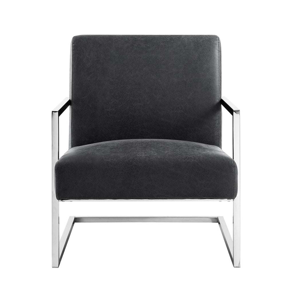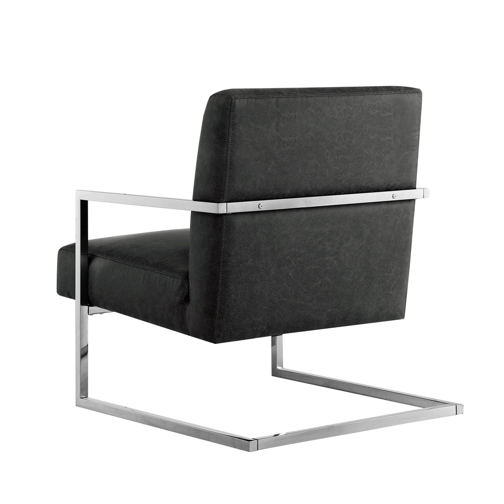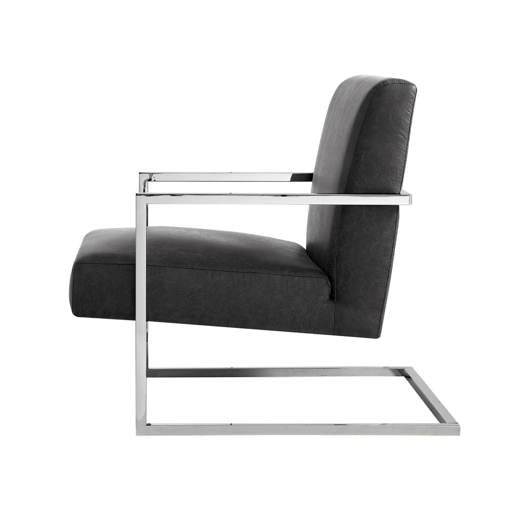 Unique and decorative, this 27-inch charcoal and silver faux leather arm chair will leave a lasting impression. This sturdy faux leather upholstered arm chair comes in a chic solid charcoal color to give your space just the right look. The sturdy inner frame is built with high quality plywood, includes armrests, and features a cushion back that is accented with soft and comfortable cushioning. 32-inch H x 27-inch W x 36-inch D
