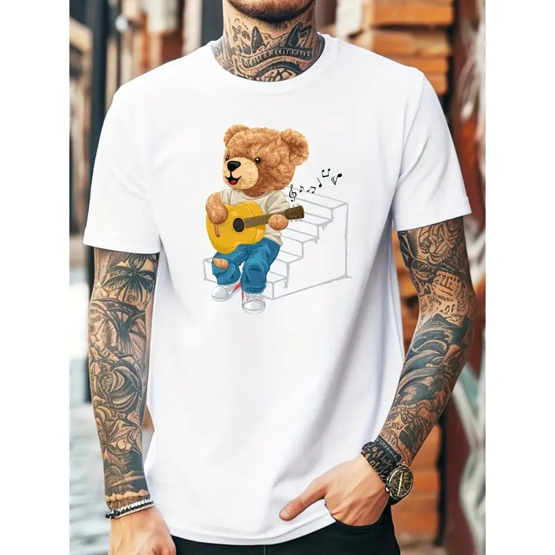 Casual Design Men's Cartoon Style Toy Bear Guitar Player Pattern Crew Neck Short Sleeve T-shirt, Chic And Stylish Tops For Summer Leisurewear And Sports Wear Made in USA